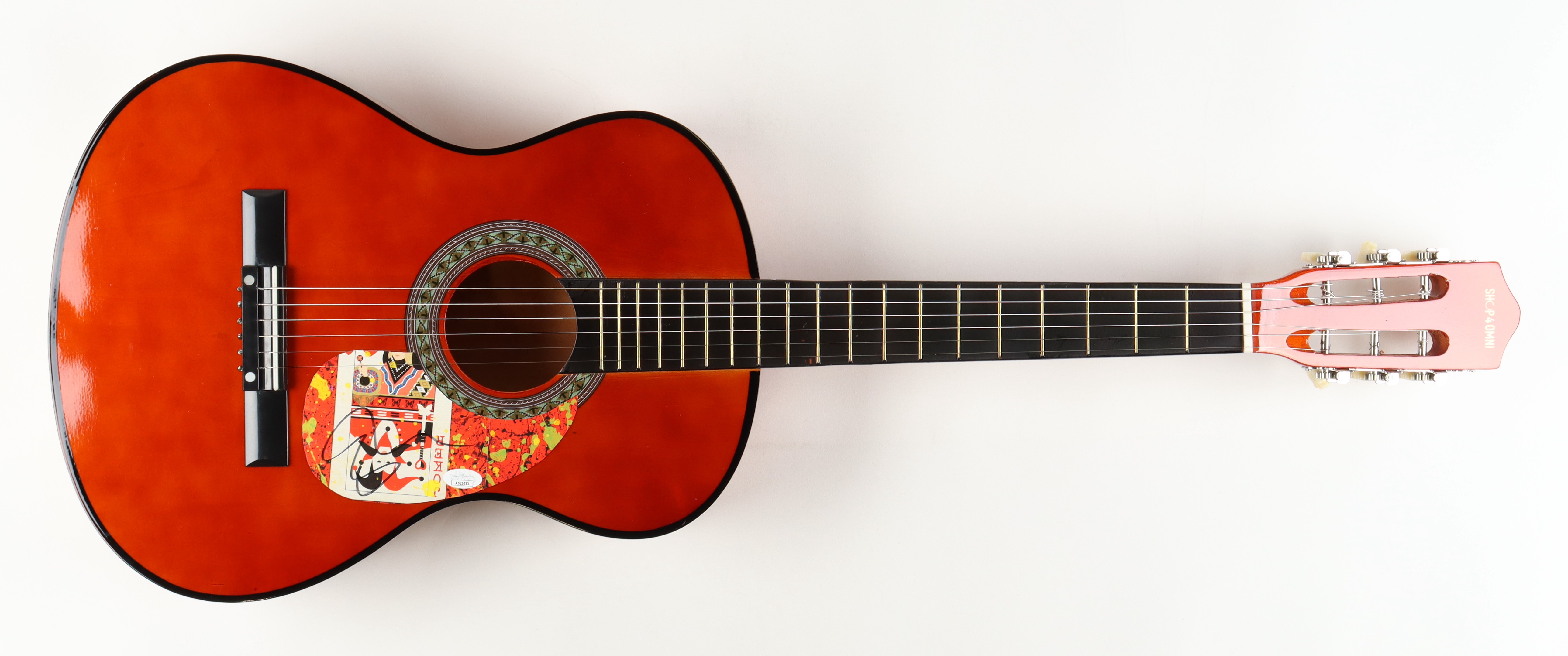 Shop 4 Omni acoustic guitar measures approximately 38" in length and has been hand-signed on a CD cover that has been repurposed as a pick-guard by Ed Sheeran. This guitar is a display guitar. It is a lower-tier version and is not the same quality as one that a musician would play.