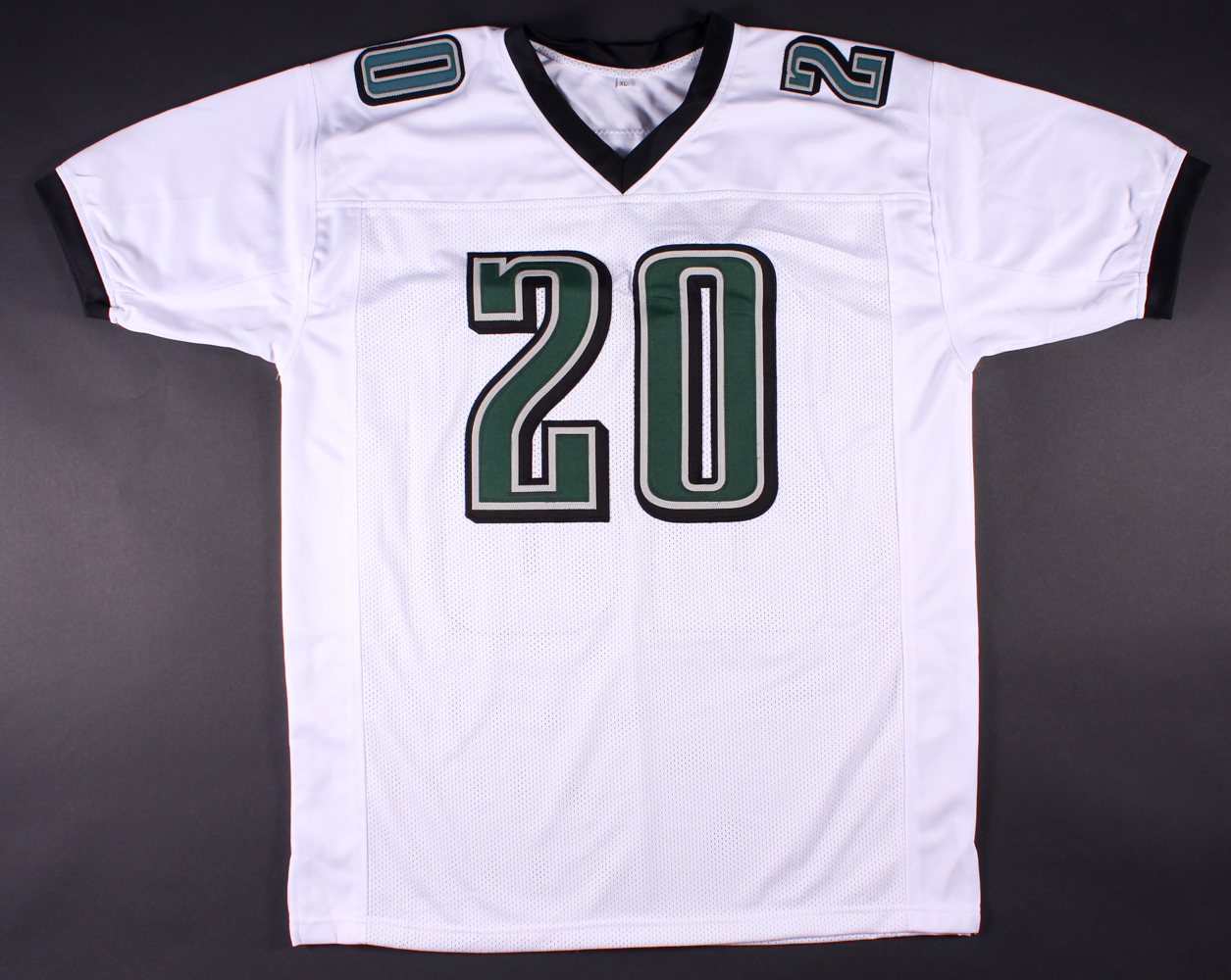 Custom on-field style jersey. Everything is sewn on, size XL. Hand-signed in silver paint pen by Brian Dawkins (Eagles, Broncos).