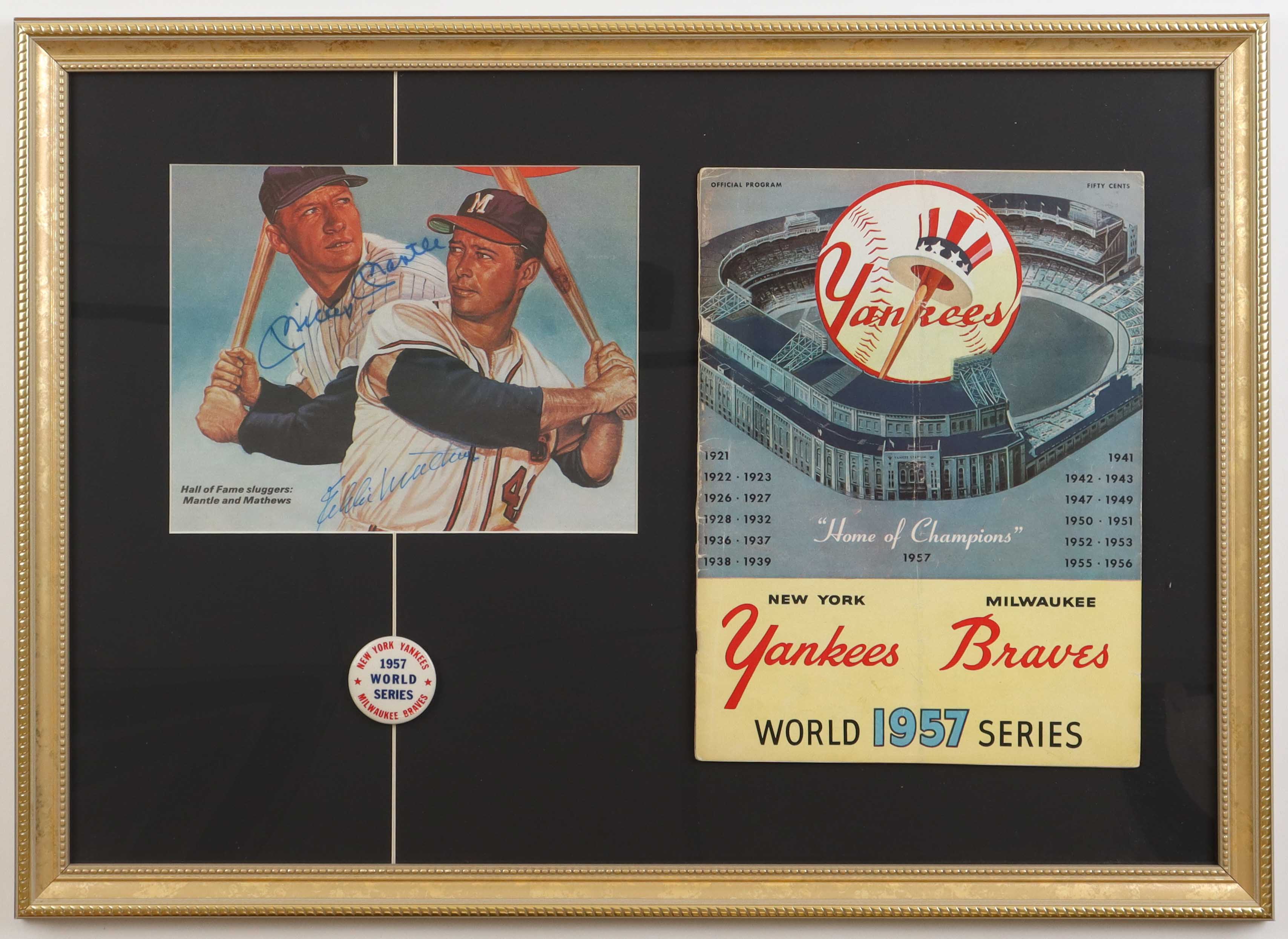 Custom frame measures 18" x 25" in size. Features a photo that has been hand-signed by Mickey Mantle (D. 1995, New York Yankees, HOF) and Eddie Mathews (D. 2001, Milwaukee Braves, HOF). The display also includes an original 1957 World Series program and pin.