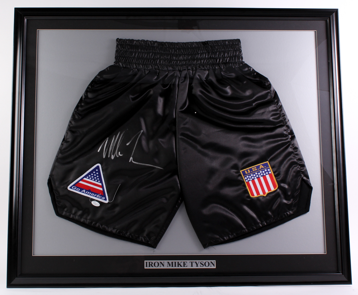 Custom framed display measures 33" x 38" in size and features a pair of boxing shorts that have been hand-signed in silver paint pen by Mike Tyson (HOF).