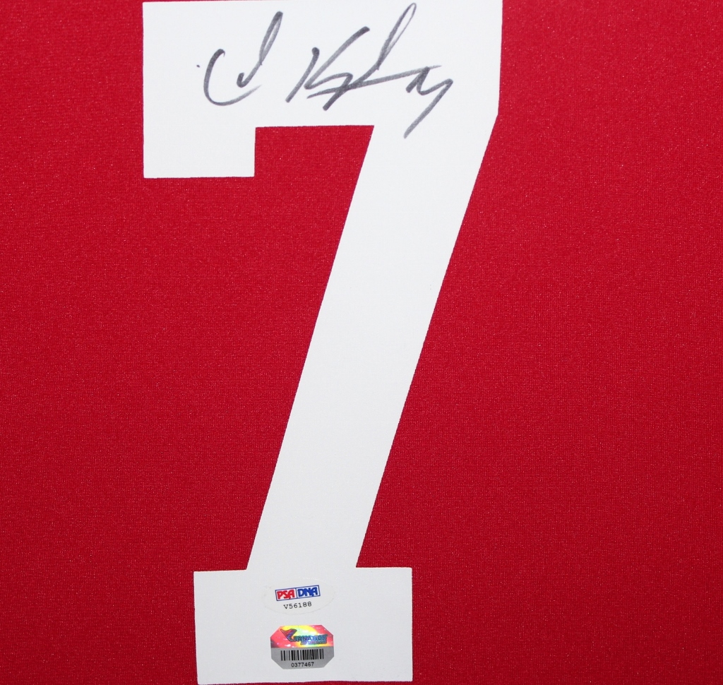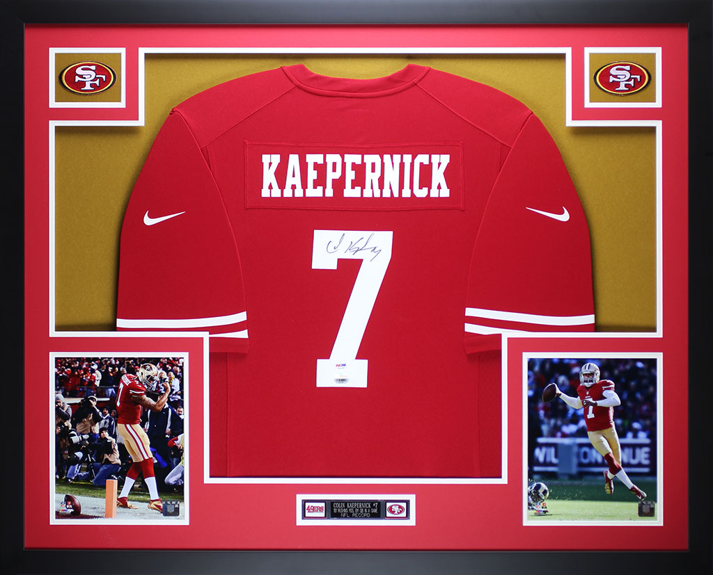 A beautifully framed autographed Collin Kaepernnick 49ers Jersey. The autograph is certified by PSA and includes a sticker on the Jersey and a matching certificate attached to the back of the frame.