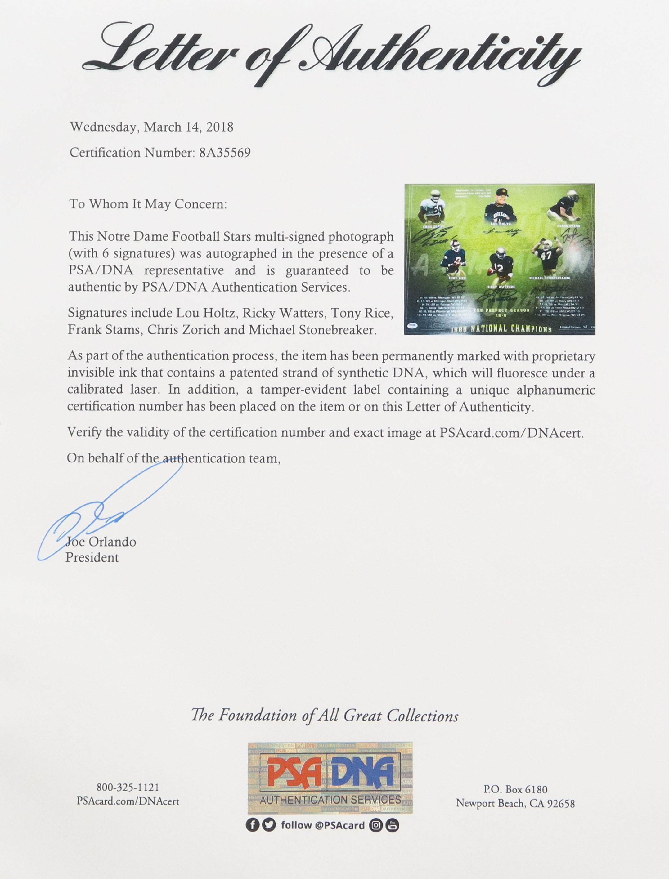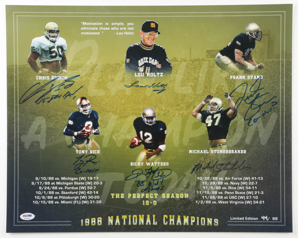 Photo measures 16" x 20" in size and has been hand-signed and inscribed by (6) including Lou Holtz, Ricky Watters, Tony Rice (D.2020), Frank Stams, Chris Zorich and Michael Stonebreaker. Photo is limited edition and has been numbered 47 out of 88.