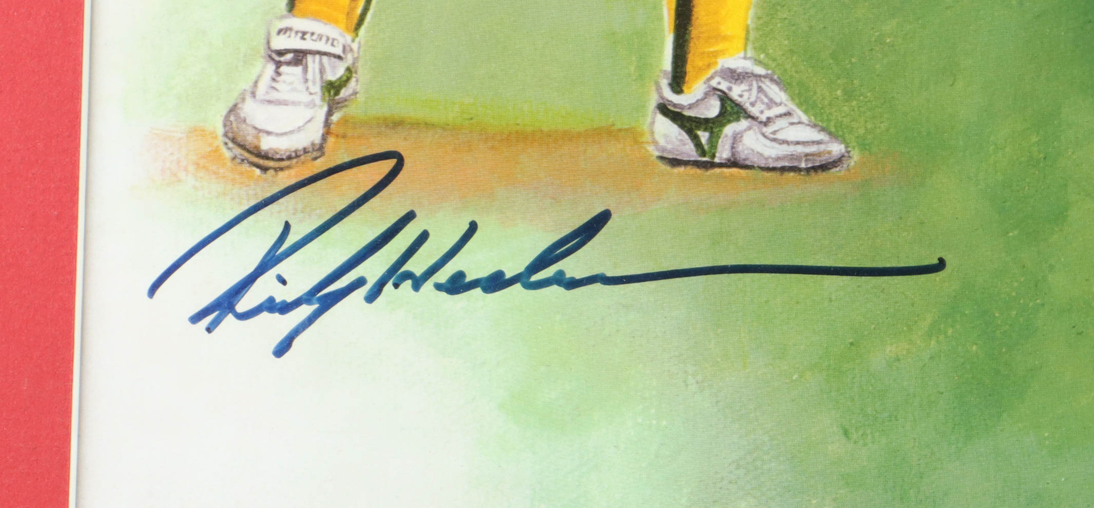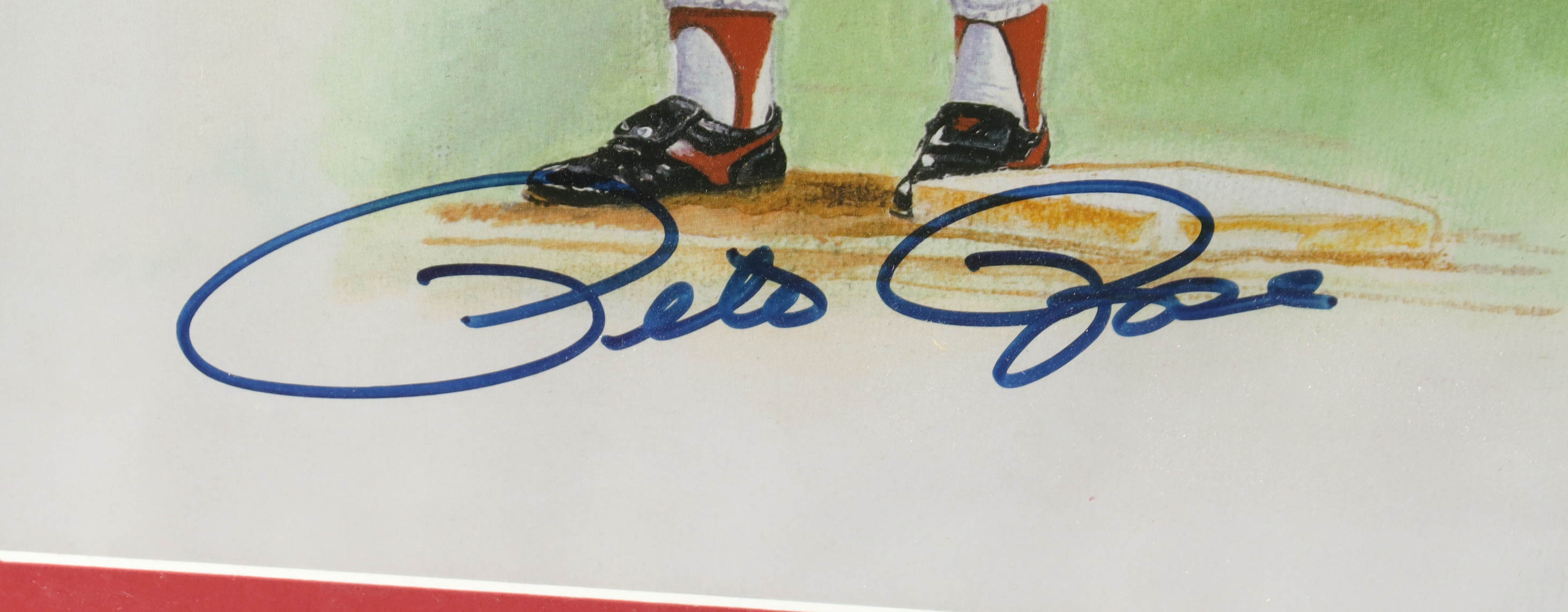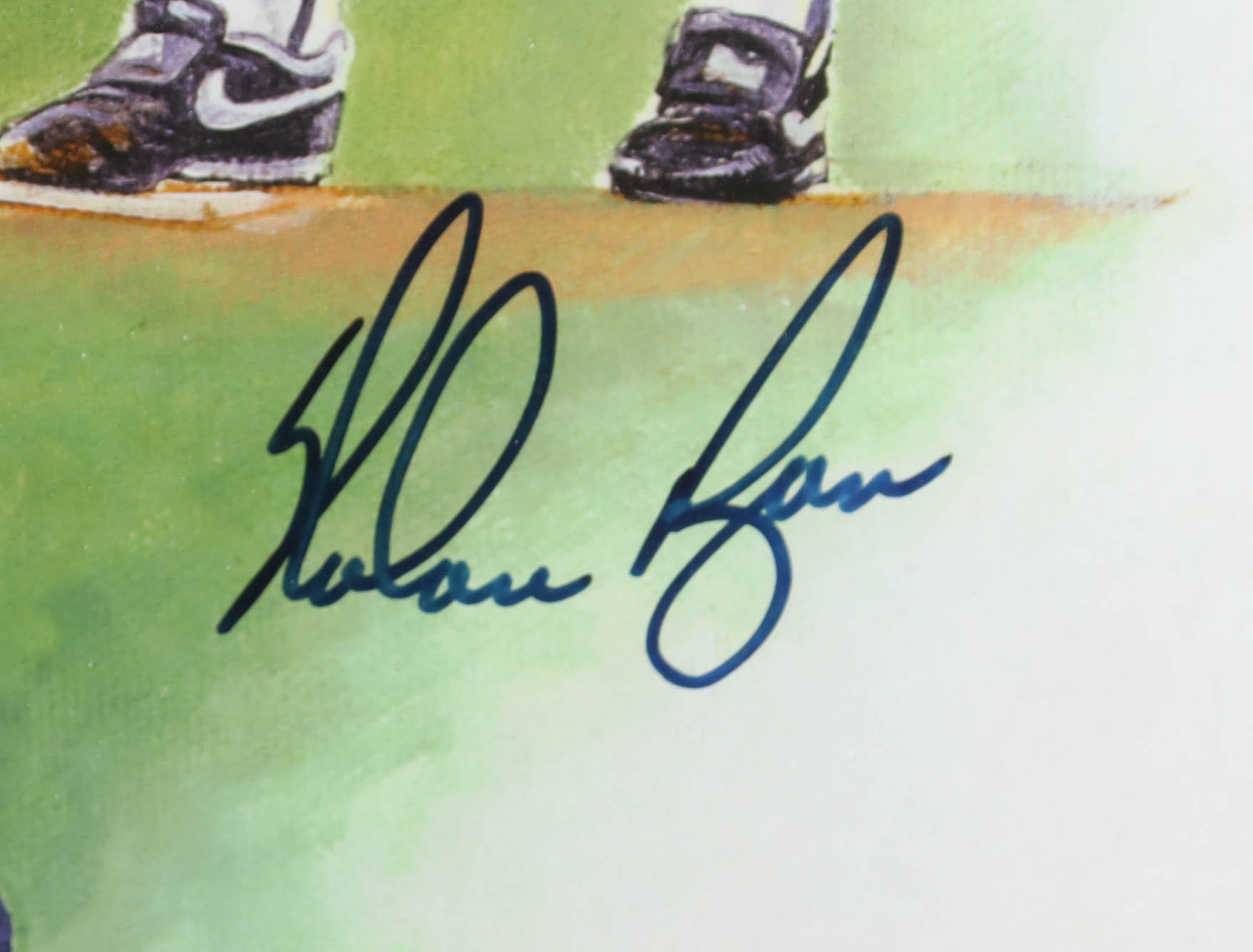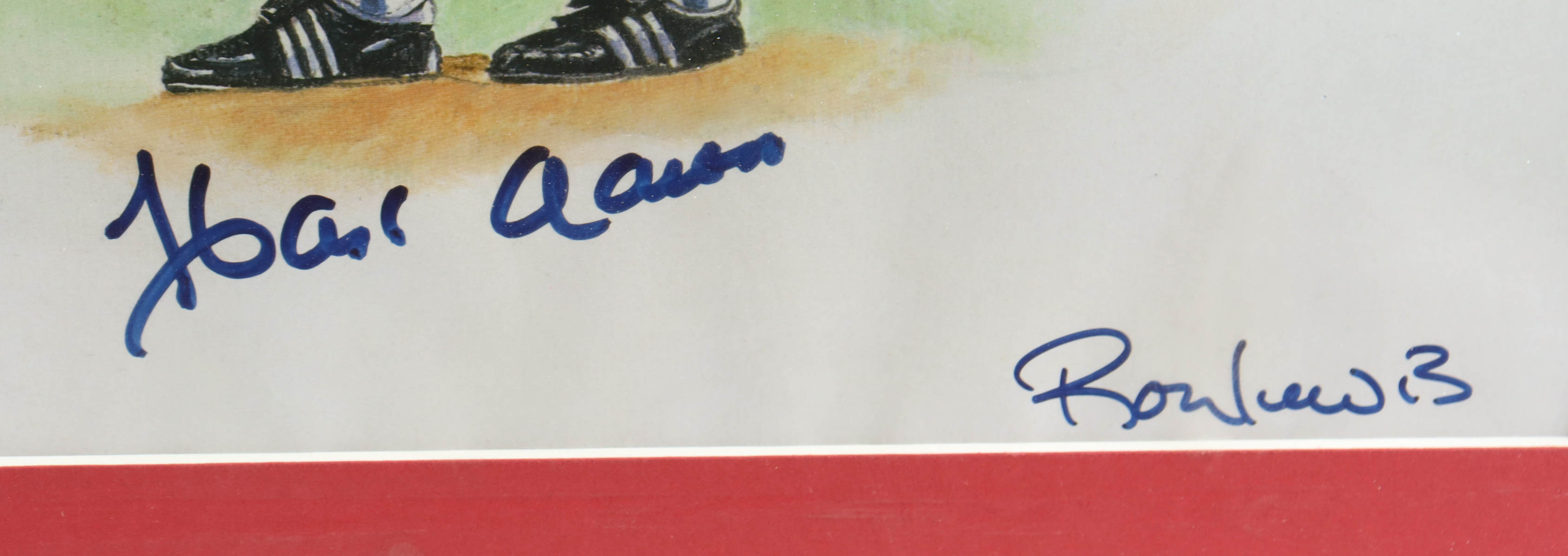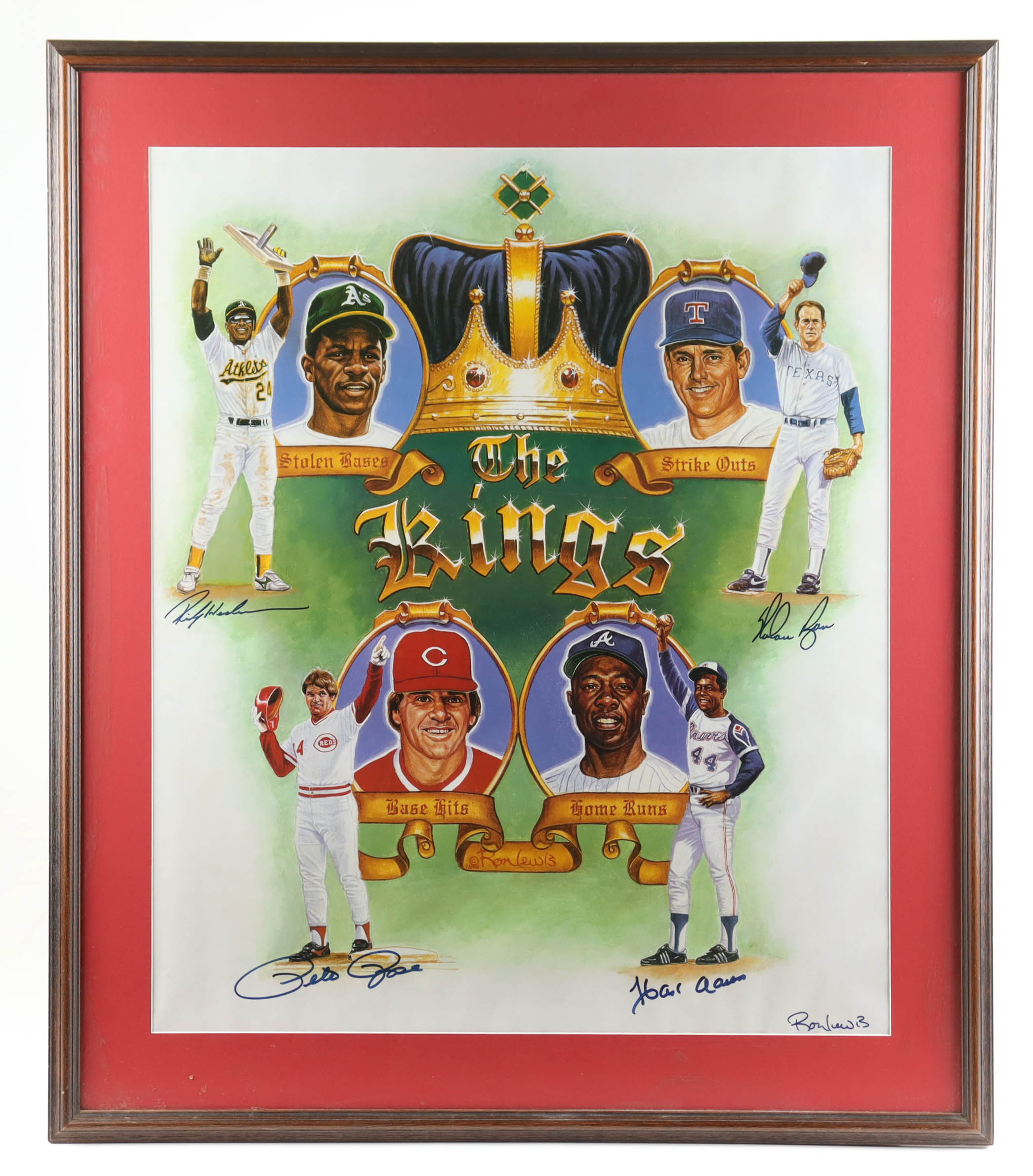 Custom frame measures approximately 30" x 36" in size and has been hand-signed by Hank Aaron (D. 2021, Atlanta Braves, HOF), Pete Rose (Cincinnati Reds), Nolan Ryan (Houston Astros, HOF), Rickey Henderson (Oakland Athletics, HOF) & Ron Lewis (Artist).