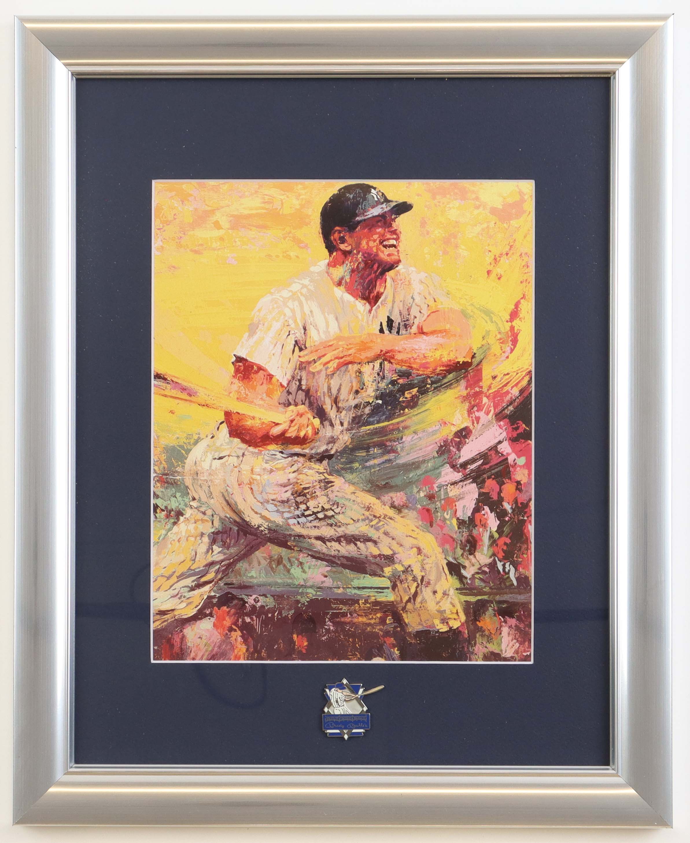Custom framed print display measures 13" x 16" in size and features a print by Leroy Neiman (D. 2012) as well as a Mickey Mantle Pin. Please note, the display is unsigned.