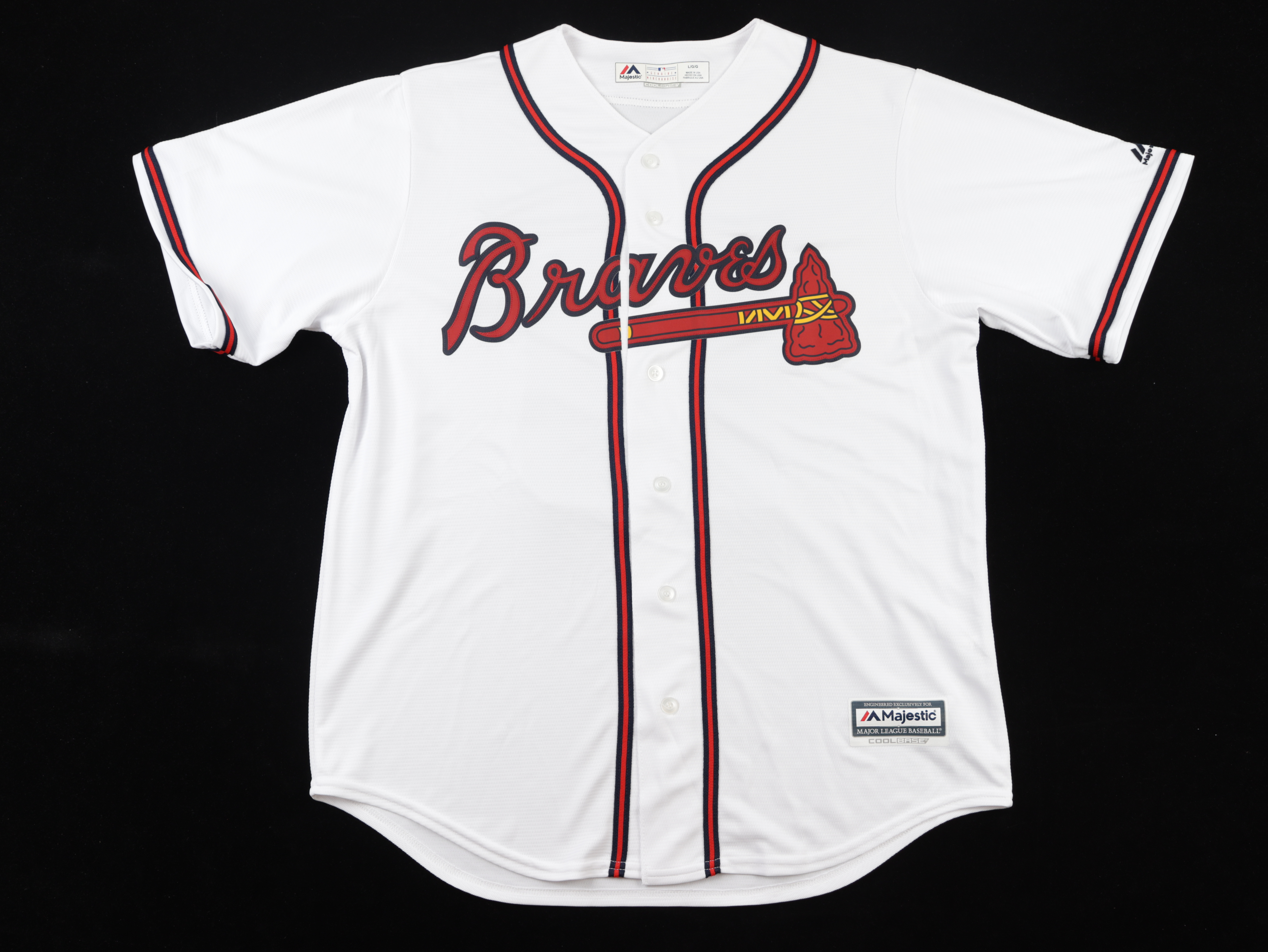 Majestic on-field style jersey. Everything is printed and stitched on, size L. Hand-signed and inscribed by Ronald Acuna Jr. (Atlanta Braves).