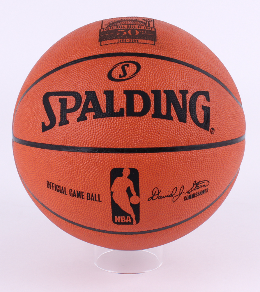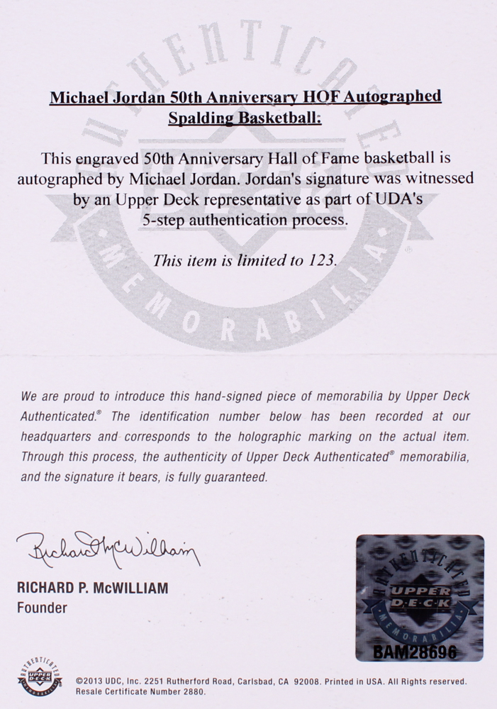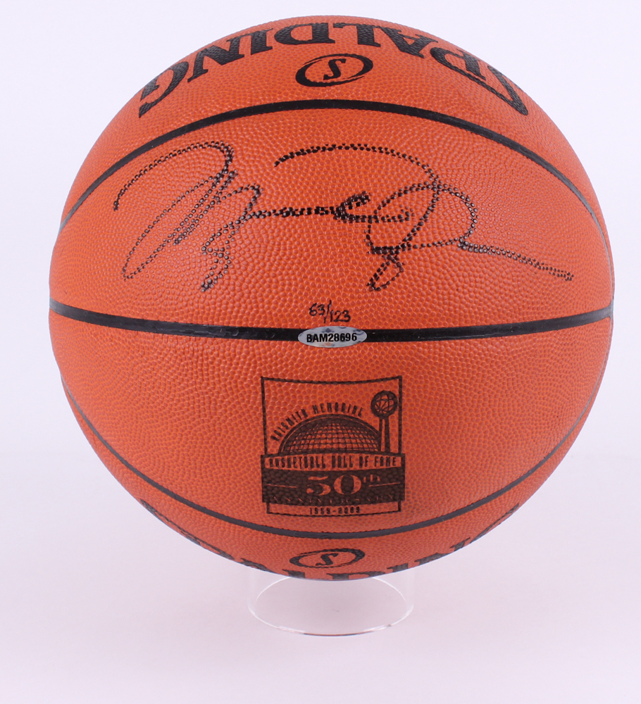 Official NBA game basketball custom engraved with a Basketball Hall of Fame 50th Anniversary logo. The ball is hand-signed in black felt tip pen by Michael Jordan (Bulls HOF). The piece is limited edition and hand-numbered #63/123.