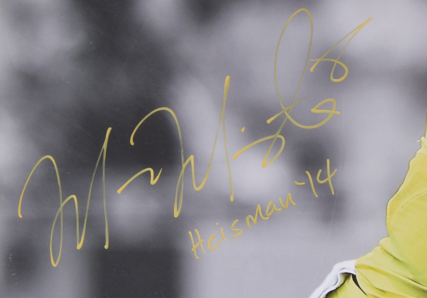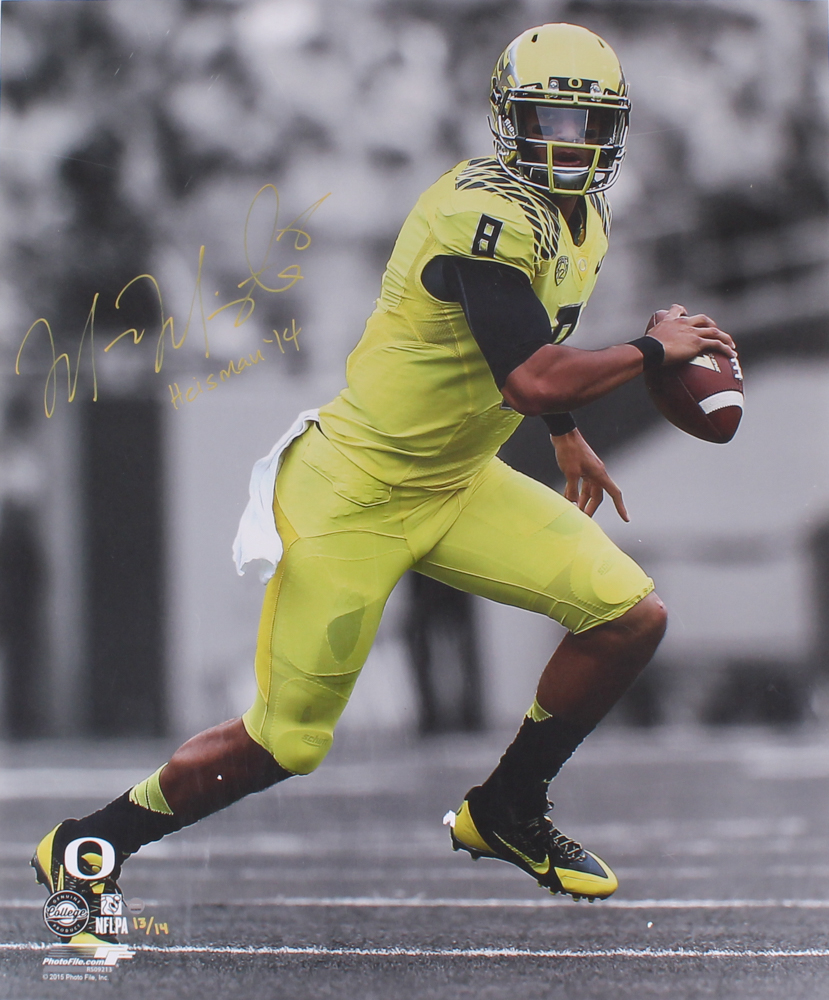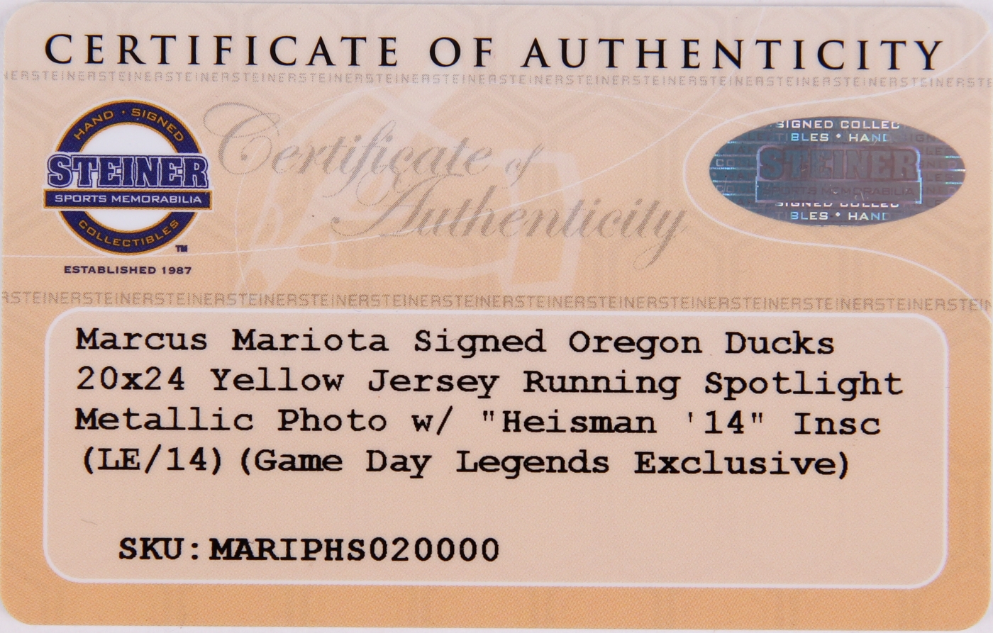 Photo measures 20" x 24" in size and has been hand signed and inscribed in yellow paint pen by Marcus Mariota (Titans). Limited edition hand numbered out of /14. Please note, photo has minor creasing on the top right corner.