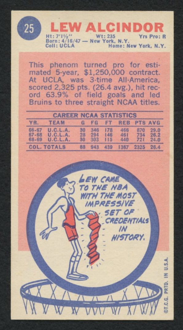1969-70 Topps #25 Lew Alcindor Rookie Card (Milwaukee Bucks). Beckett value $250. See scan for condition and detail.