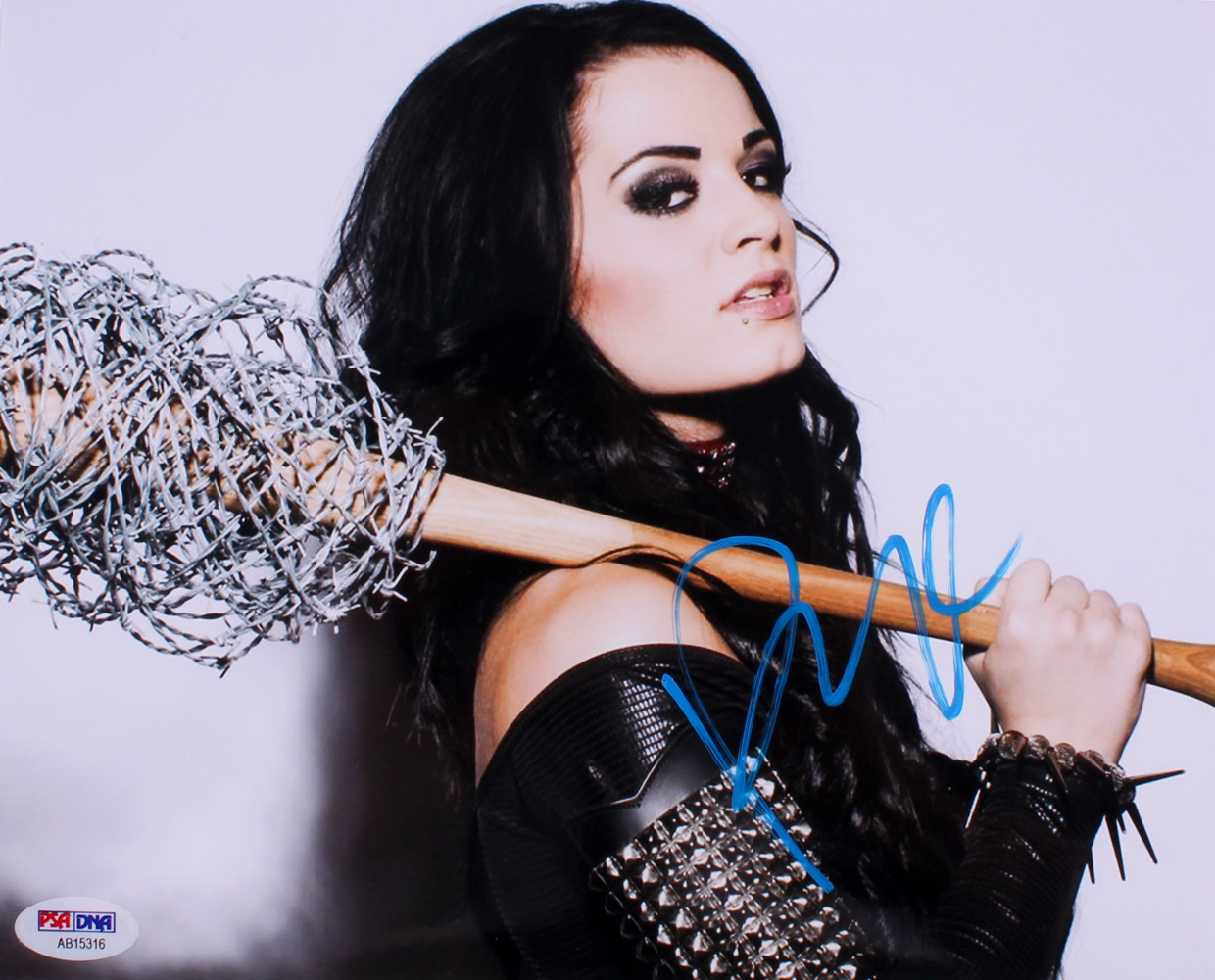 Photo measures 8" x 10" in size and has been hand-signed in blue paint pen by Paige (WWE Wrestler).