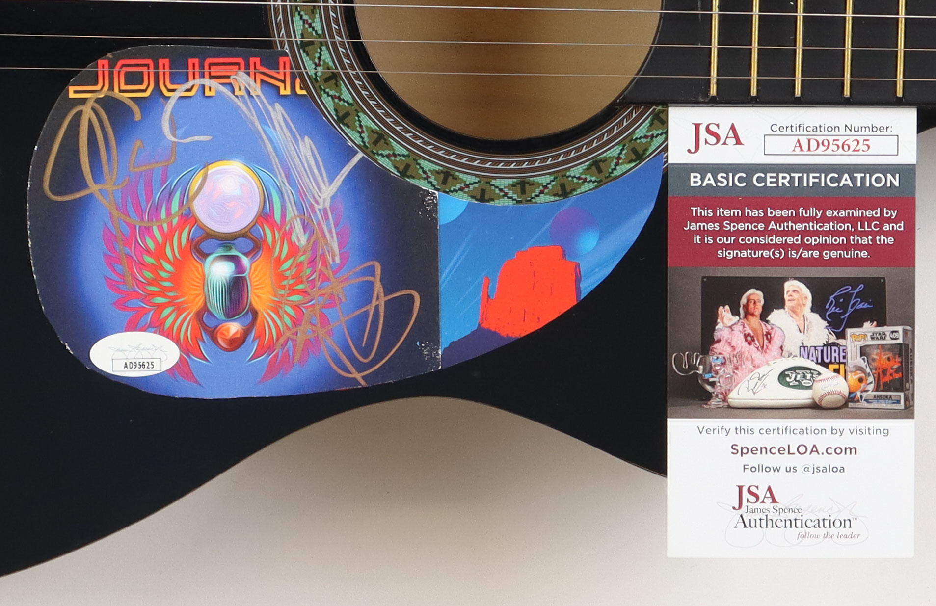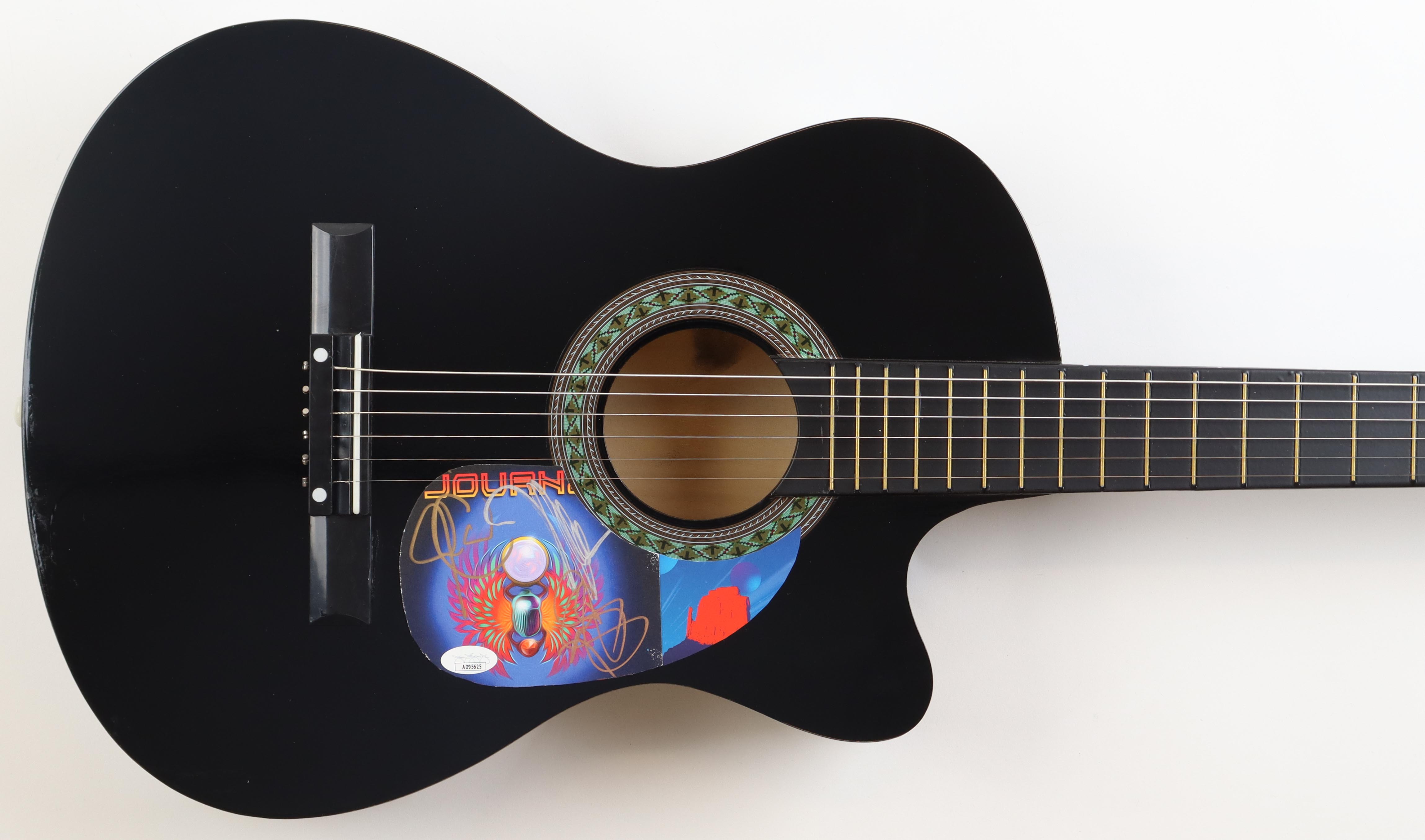 Acoustic guitar measures approximately 39" in length and has been hand-signed on the pickguard by Journey.