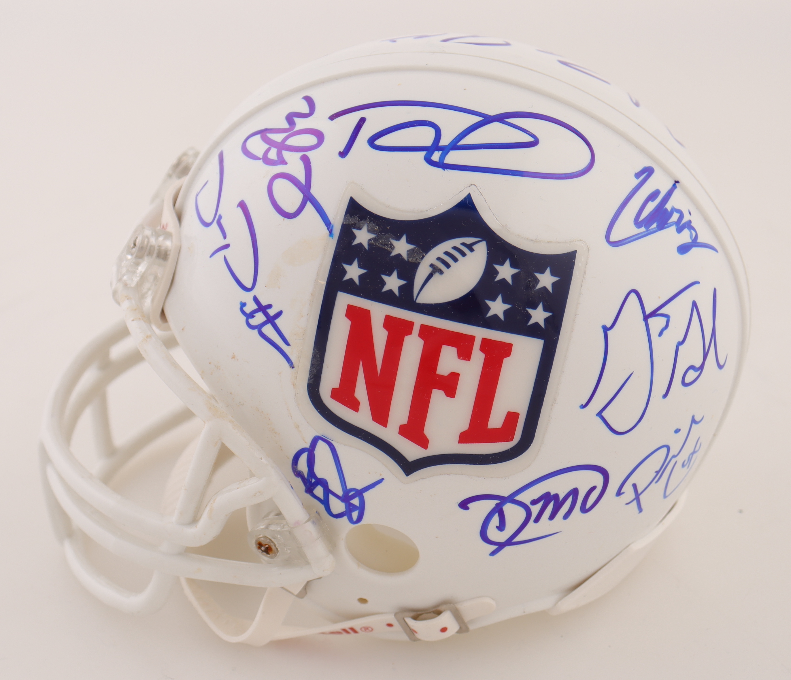 Riddell NFL Shield logo mini helmet has been hand-signed by Aaron Hernandez, Toby Gerhart, Dexter McCluster, Sean Weatherspoon, Zac Robinson, Dennis Pitta, Perrish Cox, and (10) others.