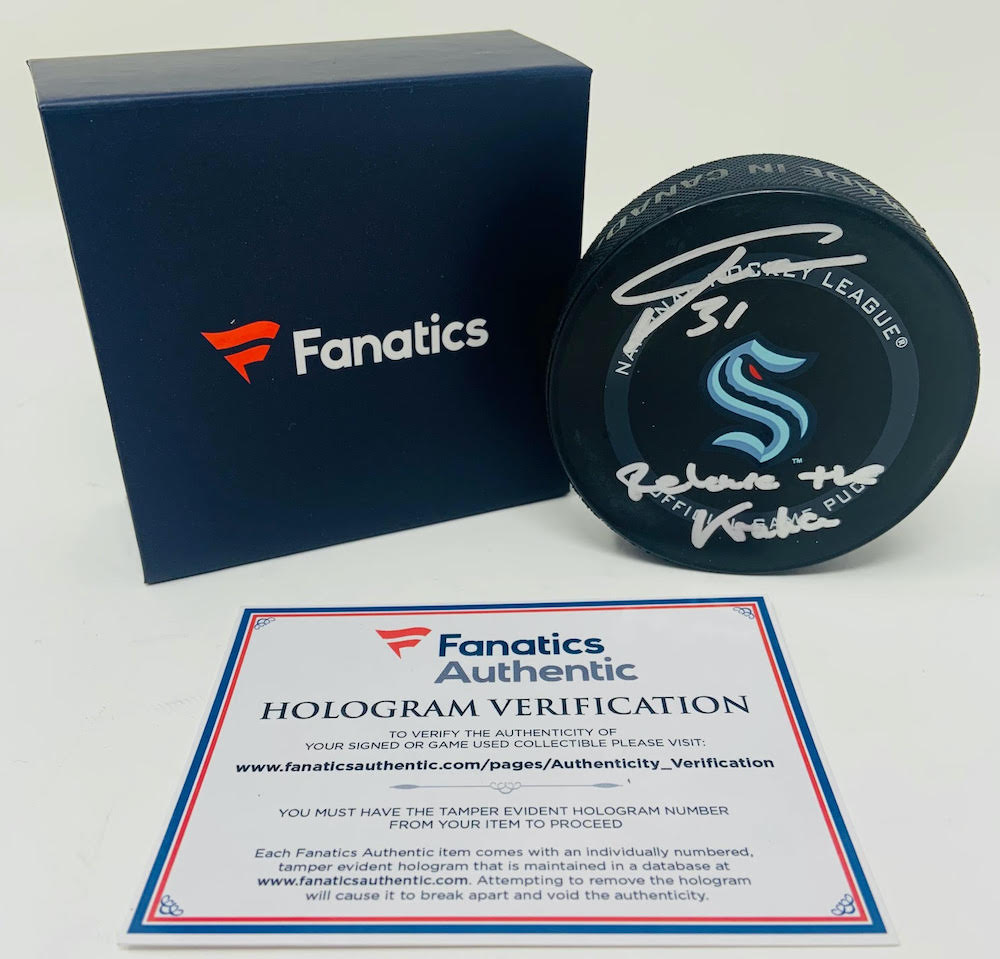 Philipp Grubauer Signed Kraken Logo Hockey Puck Inscribed "Release The Kraken" (Fanatics Hologram)