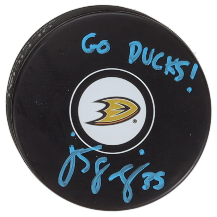 Jean-Sebastien Giguere Signed Ducks Logo Hockey Puck Inscribed "Go Ducks!" (JSA)