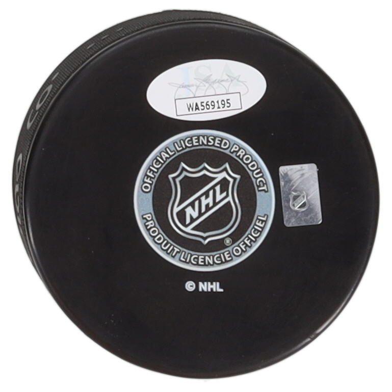 Anaheim Ducks logo hockey puck. Hand-signed and inscribed by Jean-Sebastien Giguere.