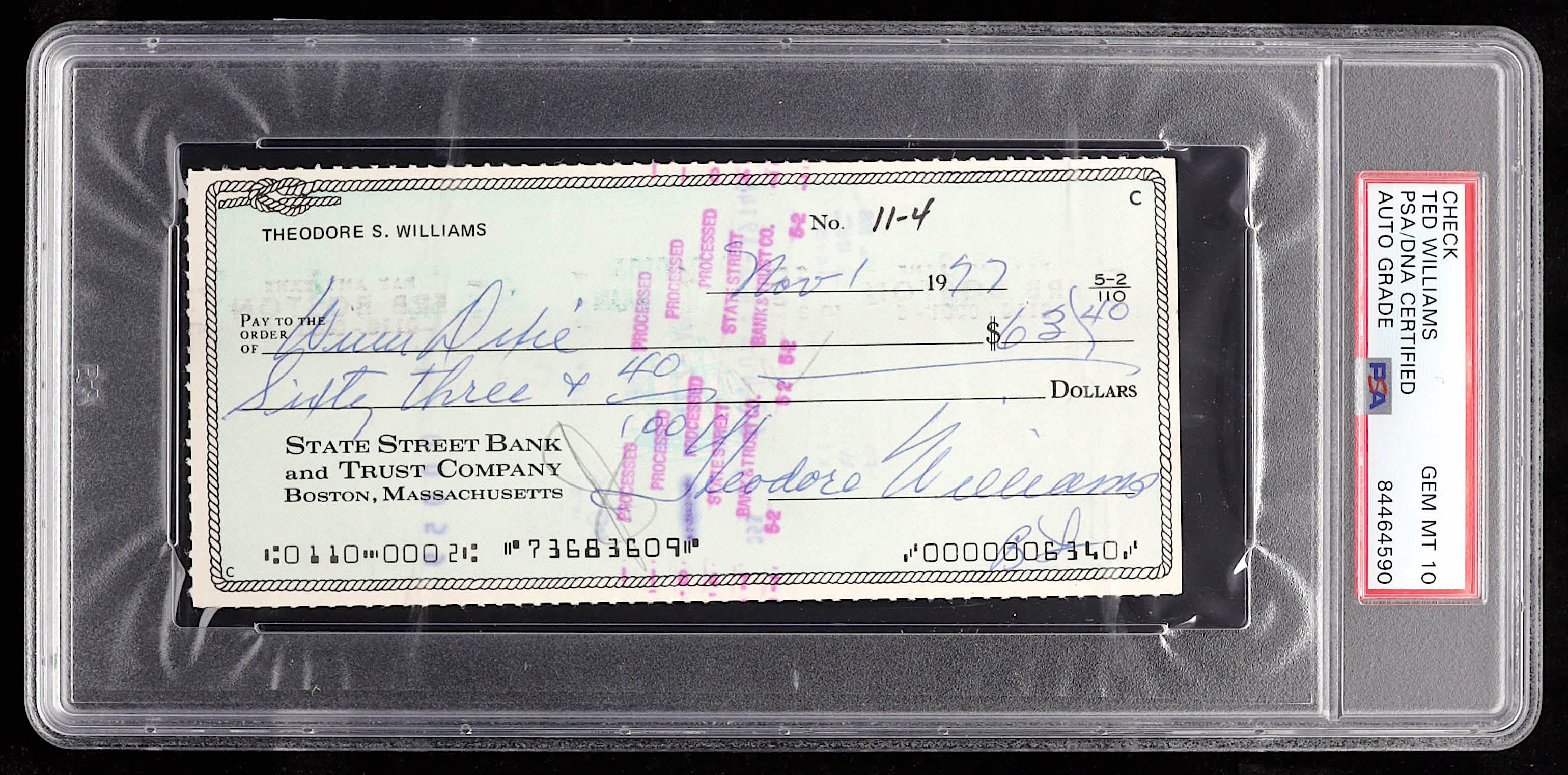 Personal bank check of State Street Bank and Trust Company in Boston, dated November 1, 1977. Hand-signed by Ted Williams (D. 2002, Boston Red Sox, HOF).