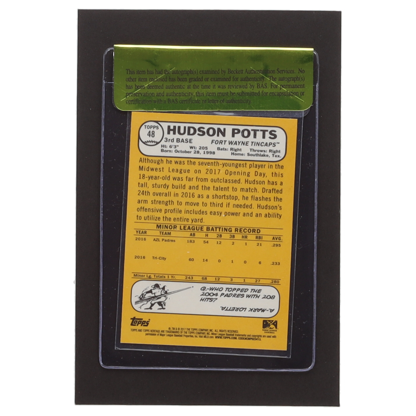 Card has been hand-signed by Hudson Potts (Fort Wayne Tincaps). Please see photos for details regarding the condition of the card.