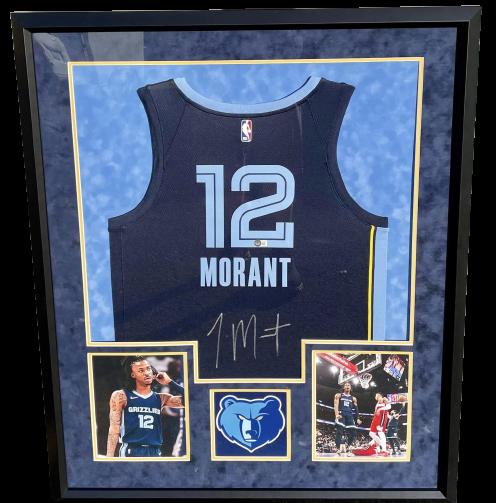 Custom framed display measures 34" x 42" in size and includes a custom on-court style style. Everything stitched on, size XL. Hand-signed by Ja Morant (Memphis Grizzles).