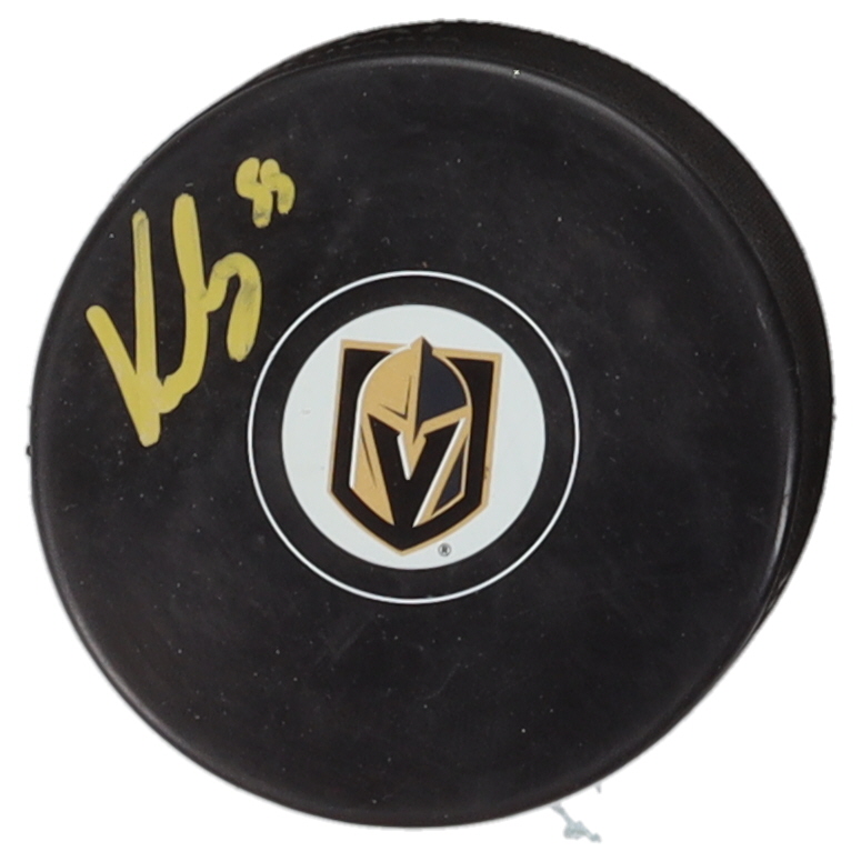 Vegas Golden Knights logo hockey puck has been hand-signed by Keegan Kolesar.