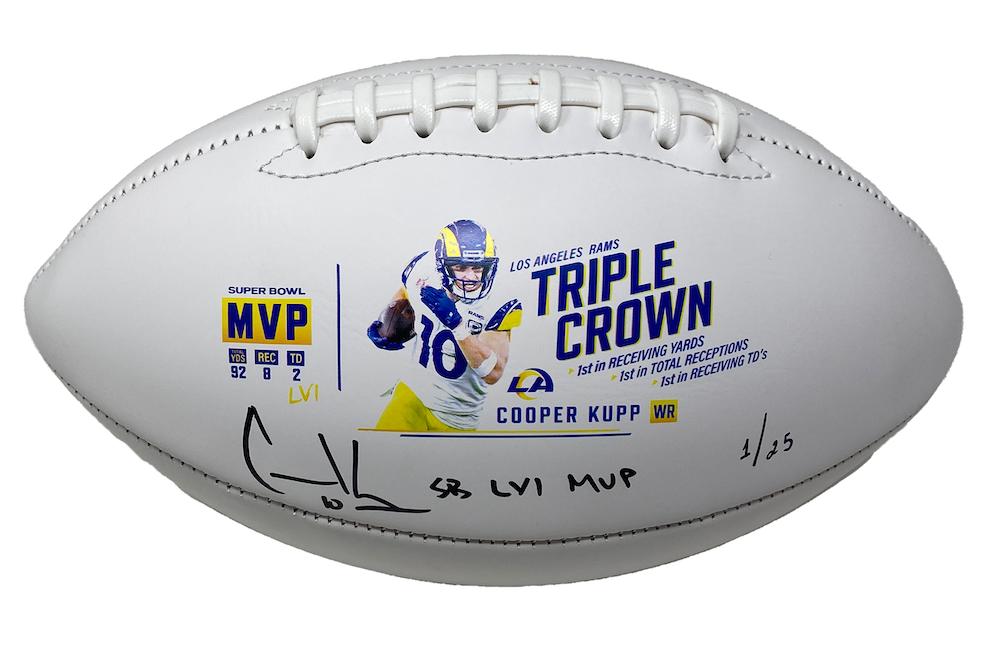 This Triple Crown commemorative white panel football has been hand-signed and inscribed by Cooper Kupp.