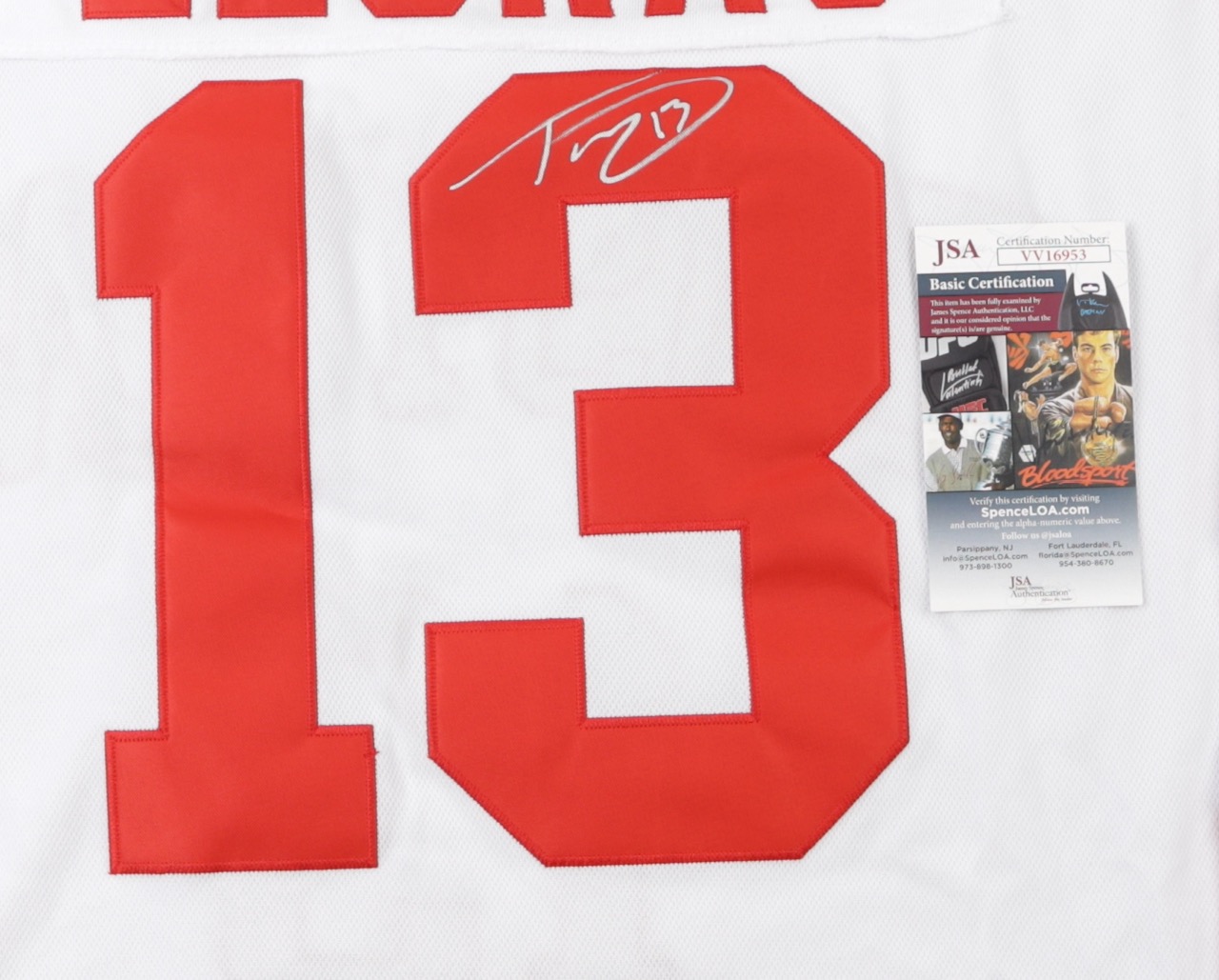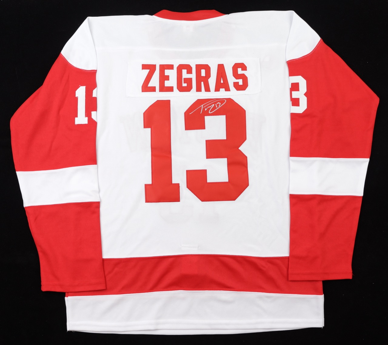 On-ice style jersey. Everything sewn on, size 52. Hand-signed by Trevor Zegras.