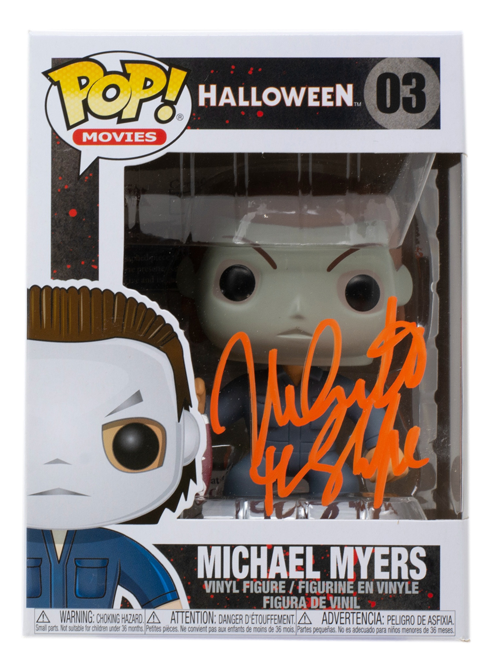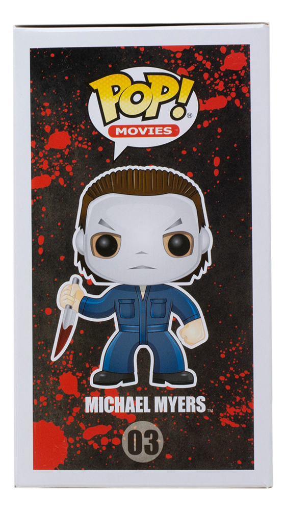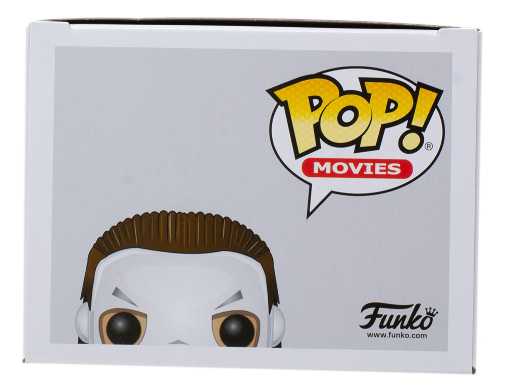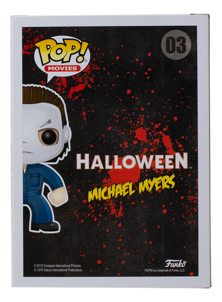 Funko Pop! vinyl figure measures approximately 4" tall. Hand-signed and inscribed on the packaging by Nick Castle (Michael Meyers).