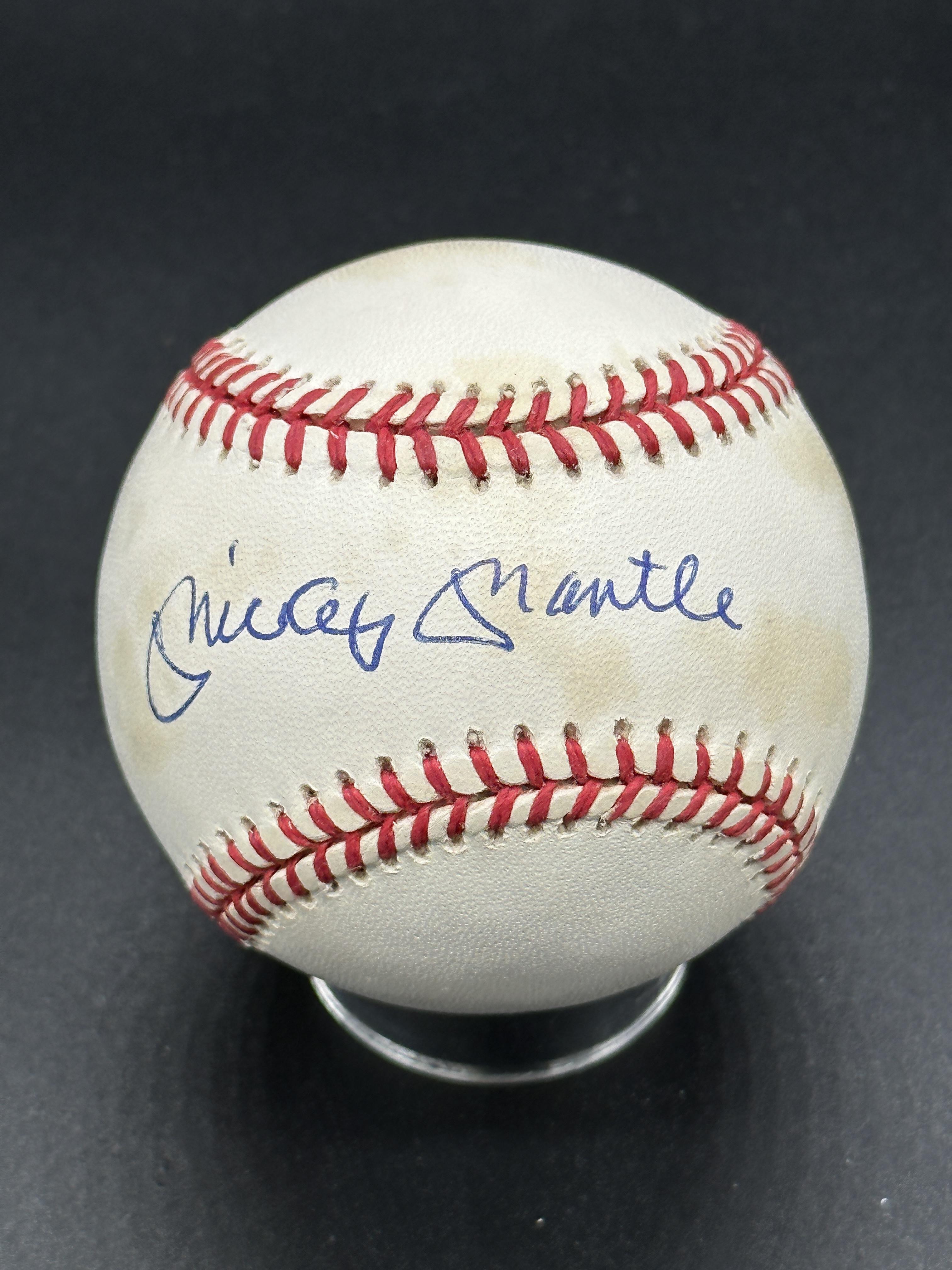 Rawlings Official American League baseball. Hand-signed by Mickey Mantle (D. 1995, New York Yankees, HOF). Please note, the baseball is naturally toned.