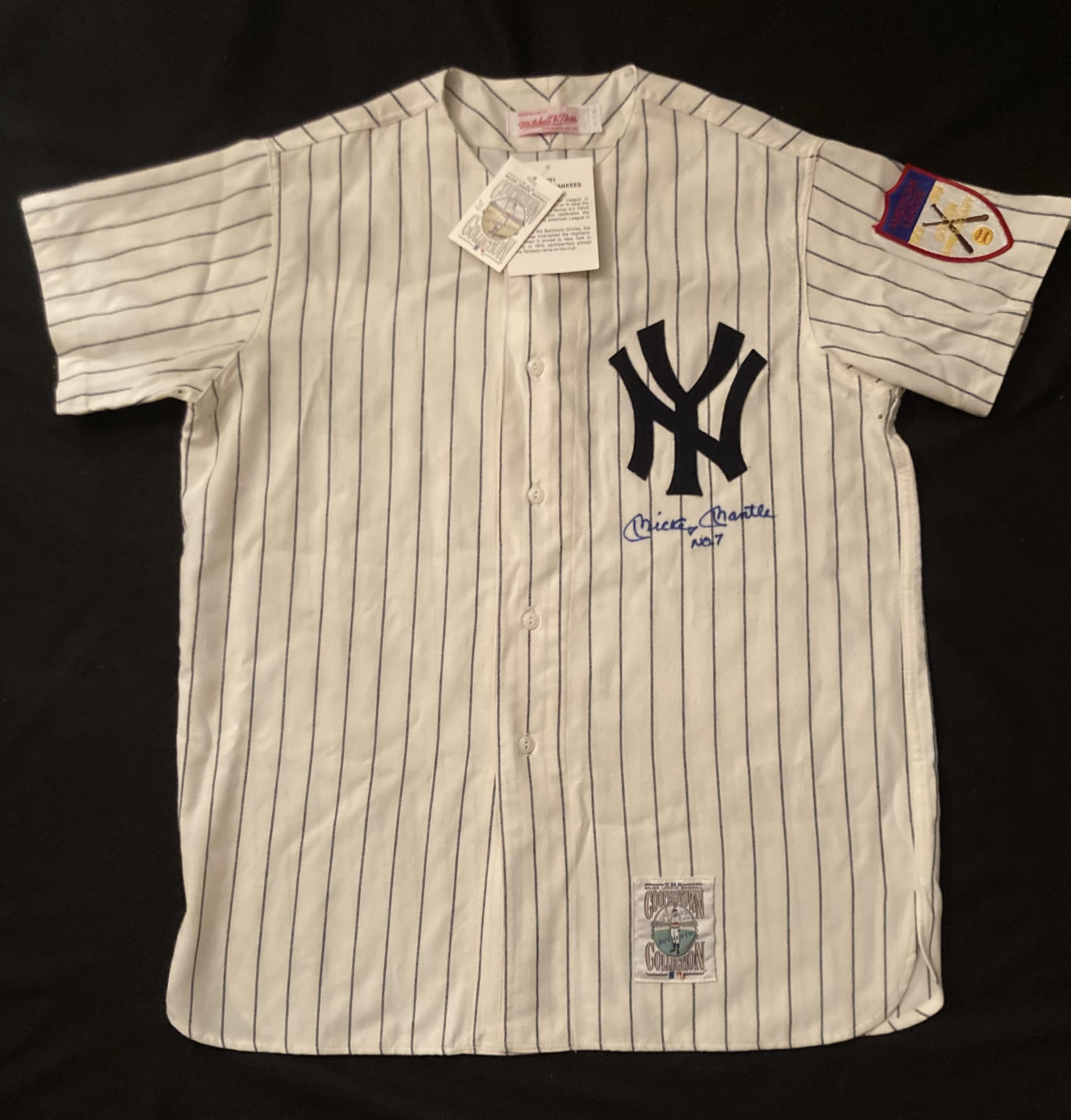 Mitchell & Ness Cooperstown Collection Pinstripe Jersey hand-signed and inscribed by Mickey Mantle (Yankees, HOF, D 1995). The jersey has the original tags.