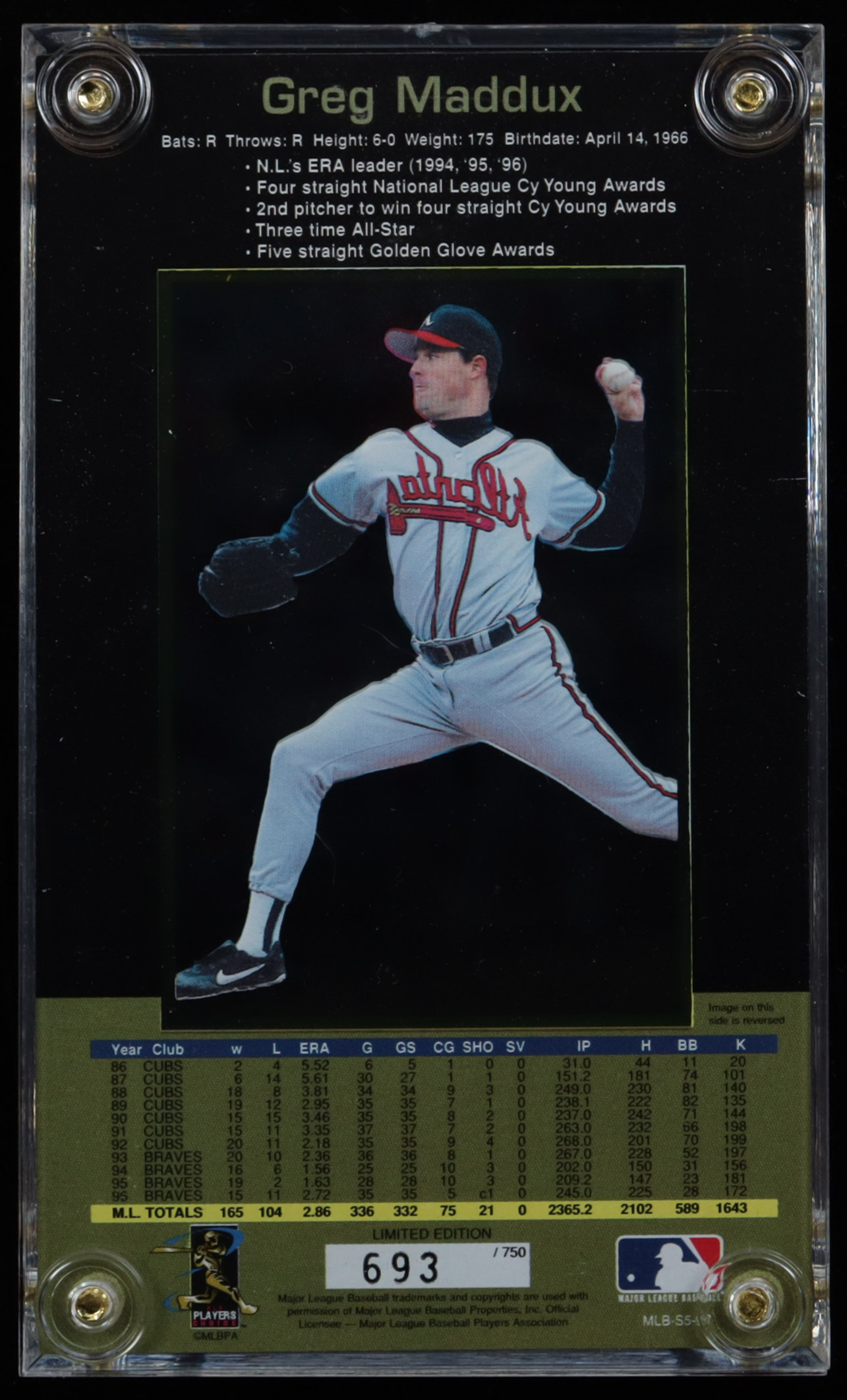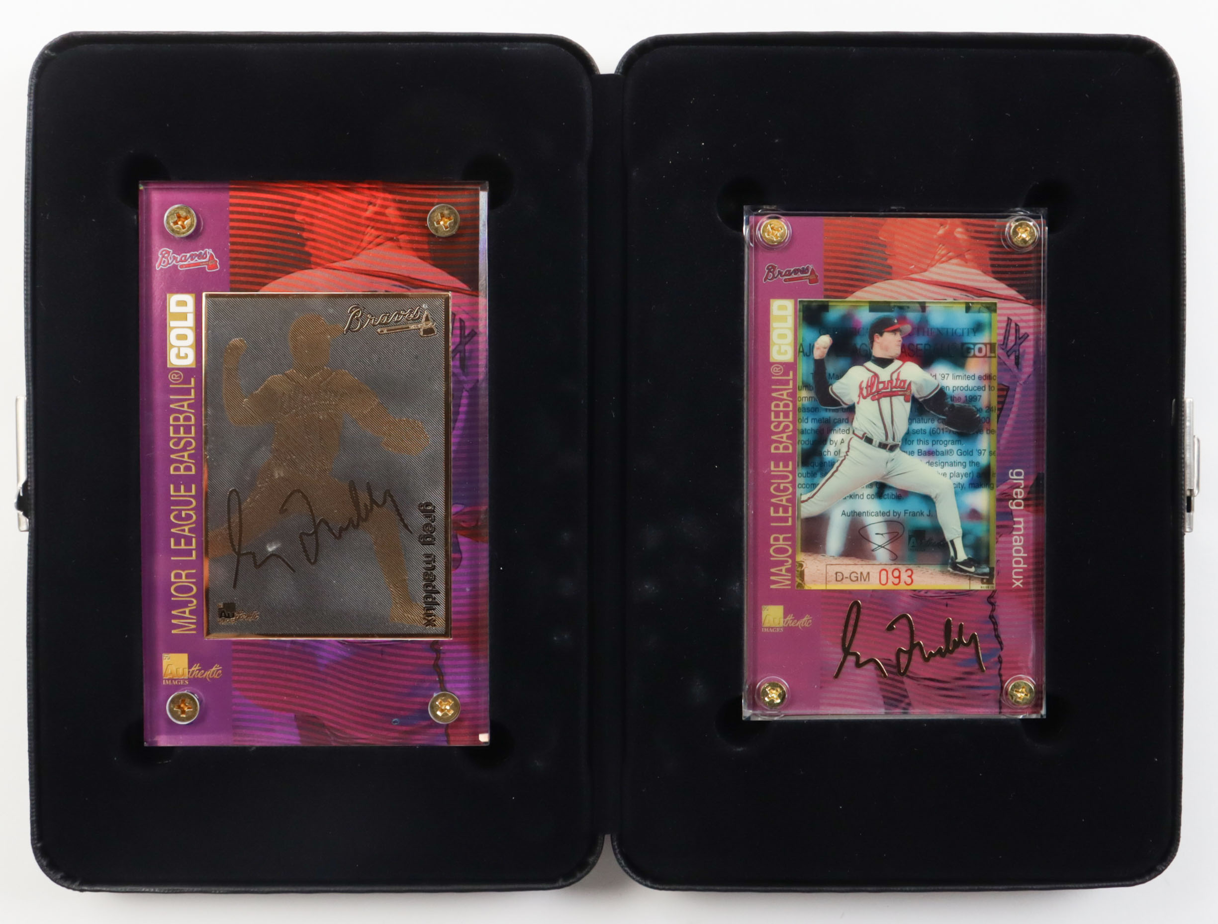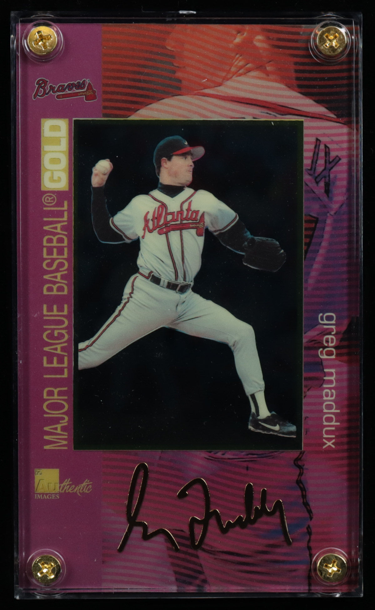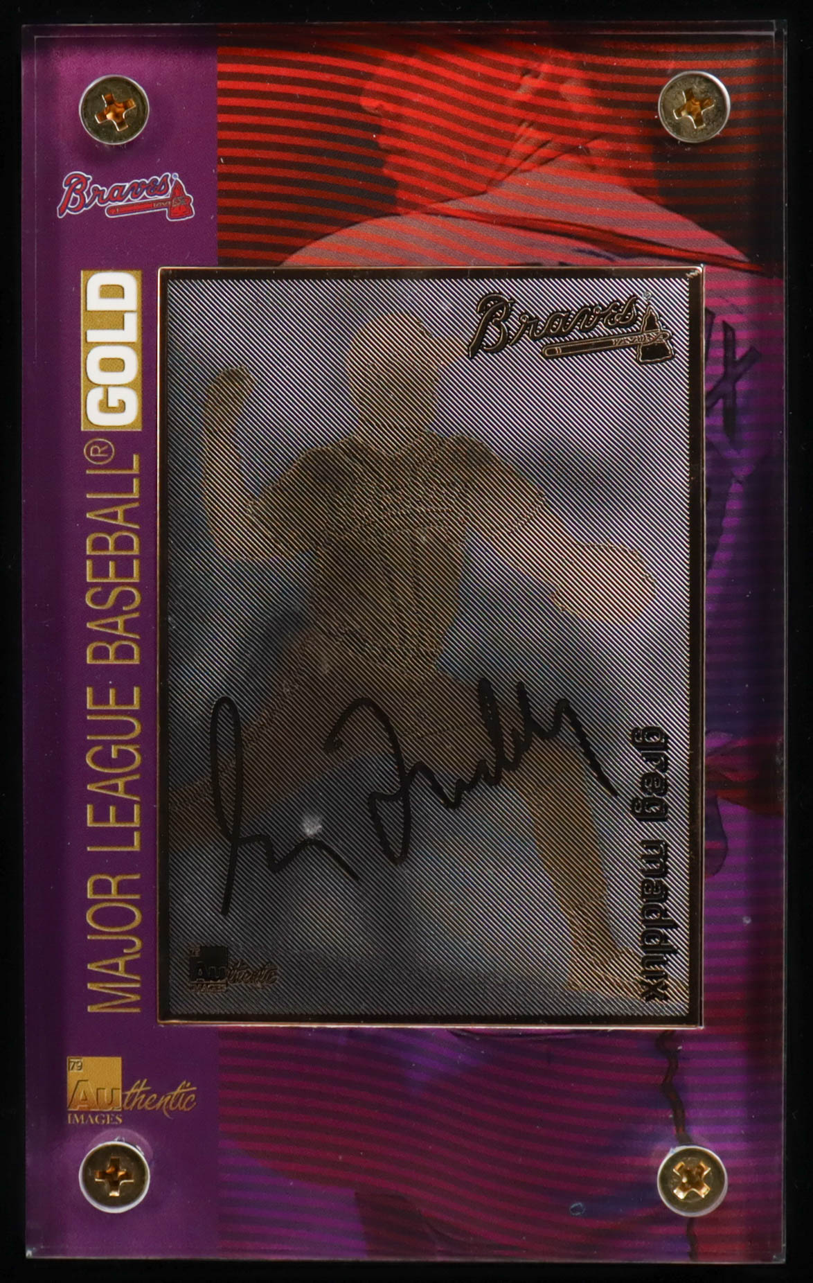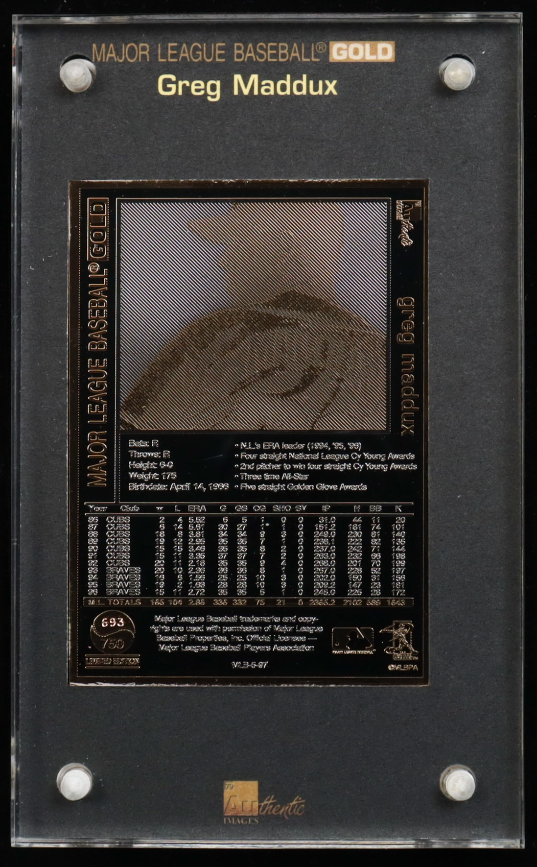 Authentic Images encased Greg Maddux (Chicago Cubs, HOF) gold card with matching gold signature card. Items are limited edition #693/750. Includes case as shown.