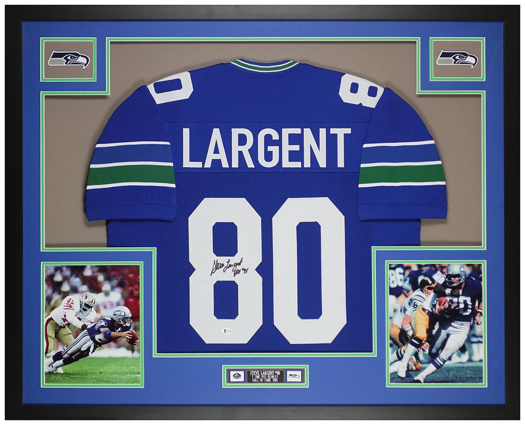 Custom frame measures 35" x 43" in size and features a jersey that has been hand-signed by Steve Largent (Seattle Seahawks, HOF).
