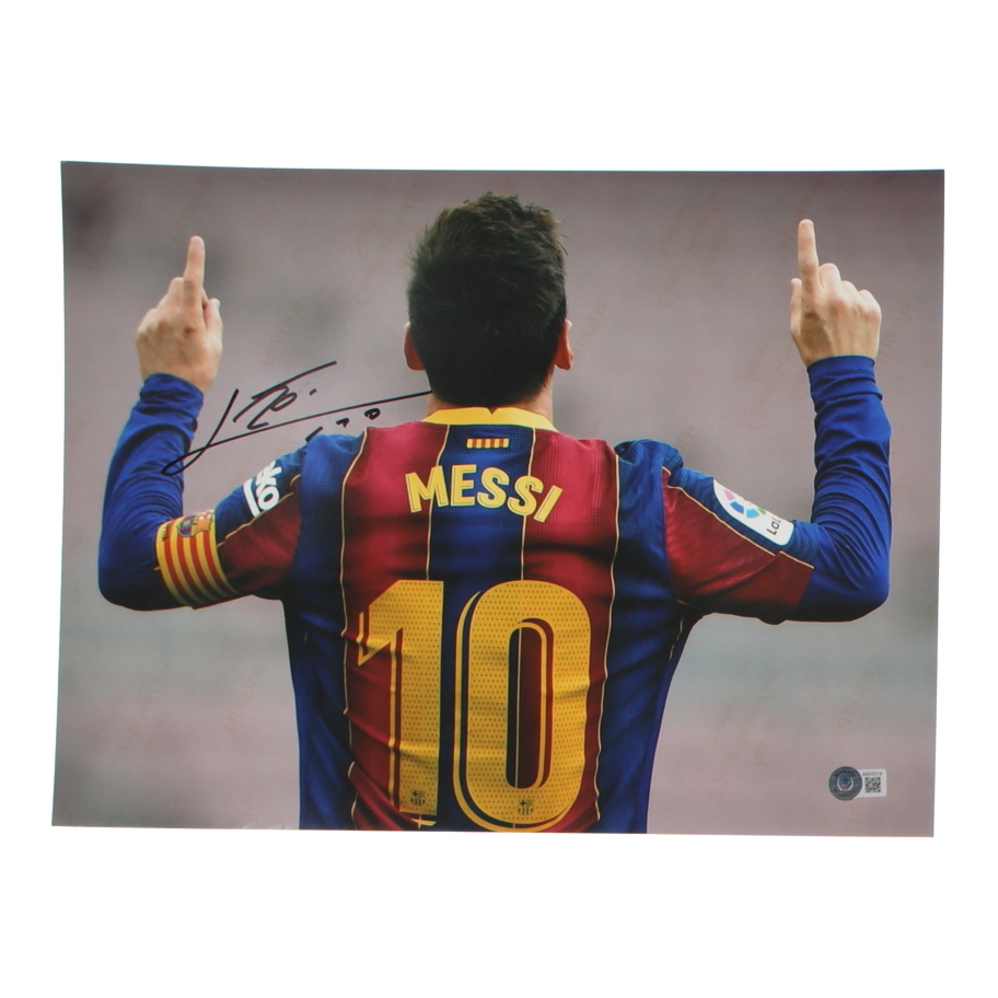 Photo measures 12" x 16" in size and has been hand-signed by Lionel Messi.