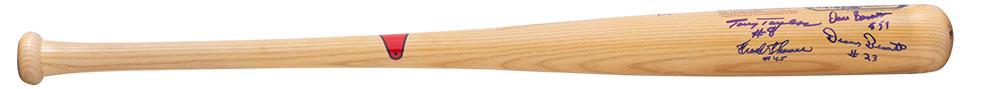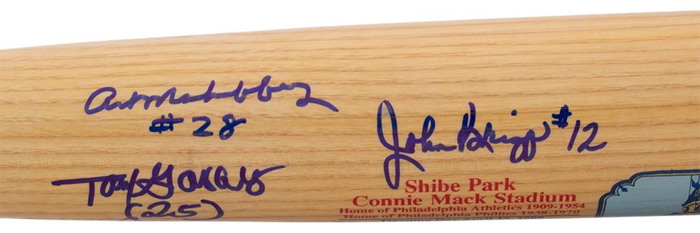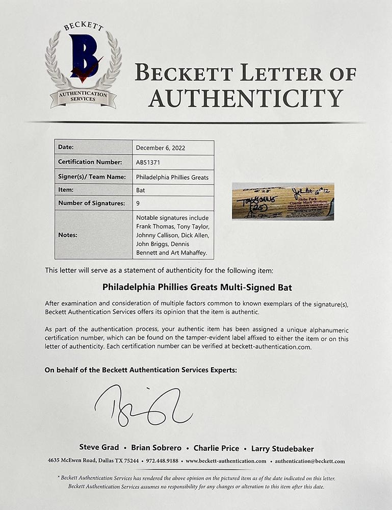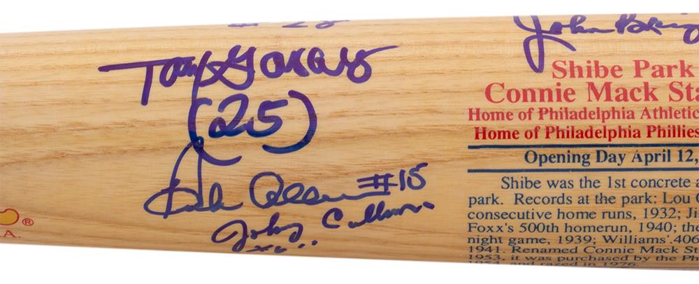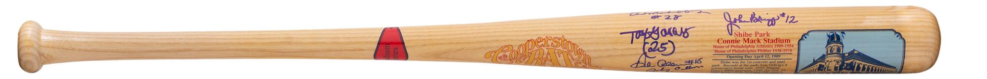 Cooperstown Shibe Park Baseball Bat hand-signed by (9) including Frank Thomas (Chicago White Sox), Tony Taylor (Philadelphia Phillies), Johnny Callison (Philadelphia Phillies), Dick Allen (Philadelphia Phillies), John Briggs (Chicago Cubs), Dennis Bennett (Boston Red Sox), and Art Mahaffey (Philadelphia Phillies).