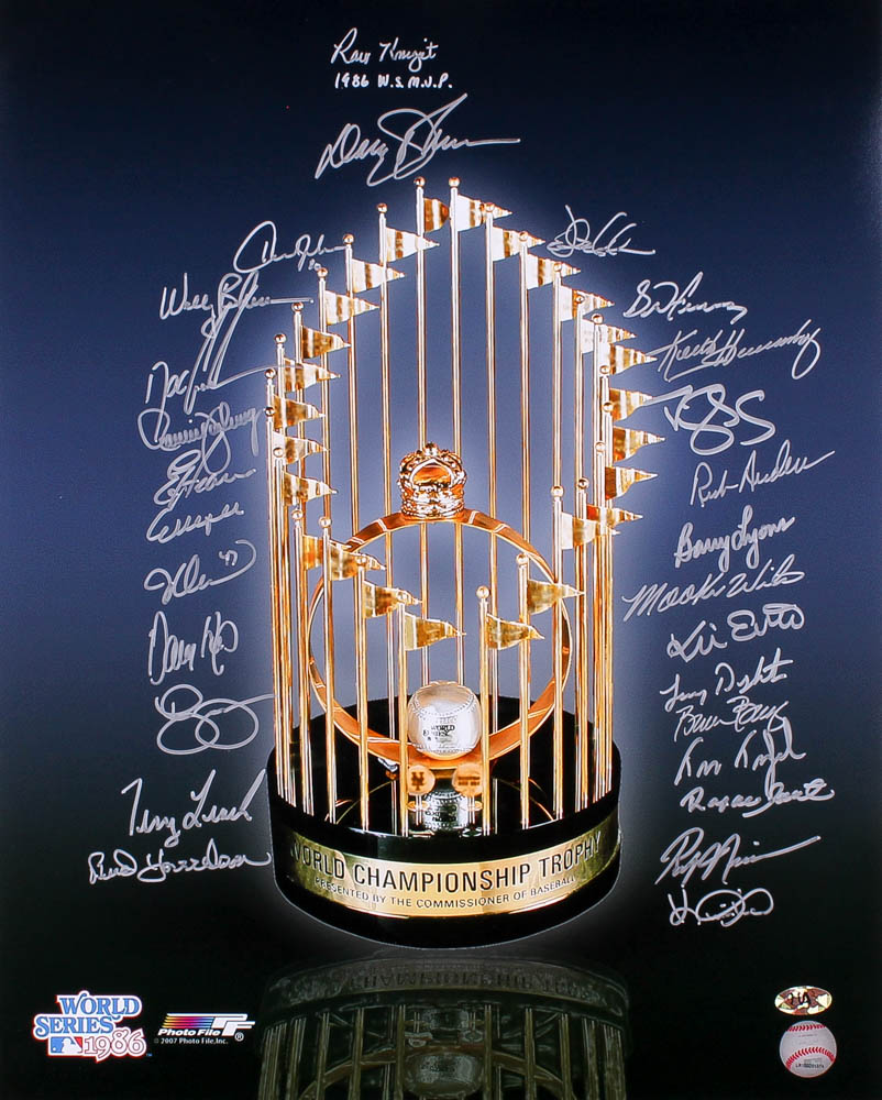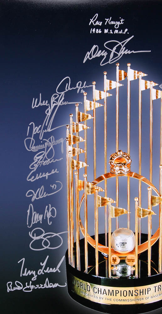 1986 Mets World Series Championship Trophy 16x20 Photo Team-Signed by (27) with Darryl Strawberry, Lenny Dykstra, Dwight "Doc" Gooden, Mookie Wilson, Bud Harrelson, Jesse Orosco (MAB Hologram)