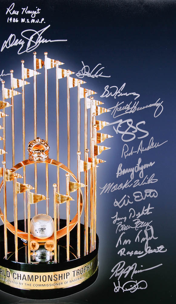 Photo measures 16" x 20" and has been hand signed in silver paint pen by (27) members of the 1986 New York Mets including, Ray Knight, Davey Johnson, Howard Johnson, Wally Backman, Dwight "Doc" Gooden, Ron Darling, Ed Hearn, Ed Lynch, Jesse Orosco, Danny Heep, Roger McDowell, Terry Leach, Dave Magadan, Sid Fernandez, Keith Hernandez, Darryl Strawberry, Rick Anderson, Barry Lyons, Mookie Wilson, Kevin Elster, Lenny Dykstra, Bruce Berenyi, Tim Teufel, Rafael Santana, Randy Niemann, Bud Harrelson, and (1) other. Ray Knight has added the inscription, “1986 WS MVP.”