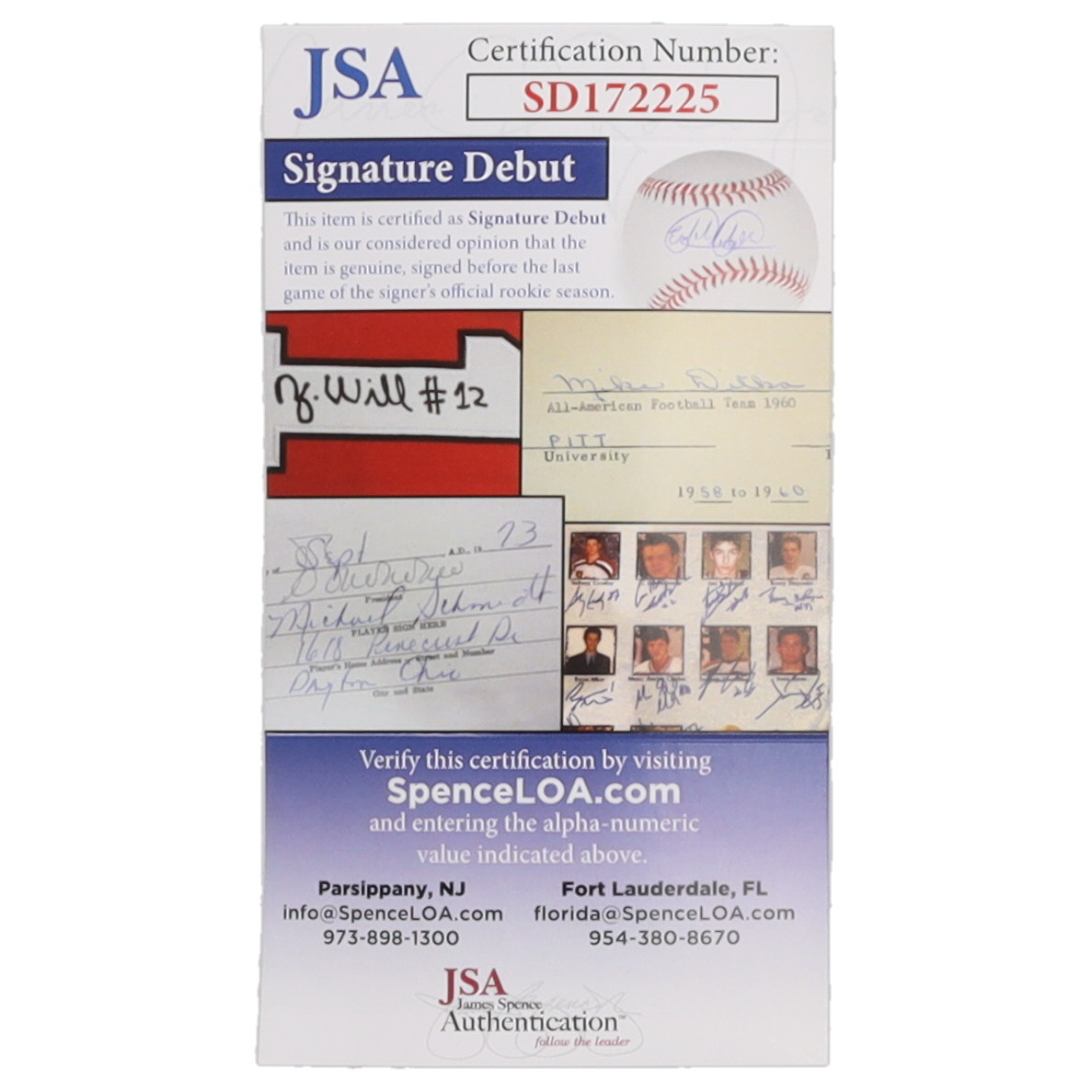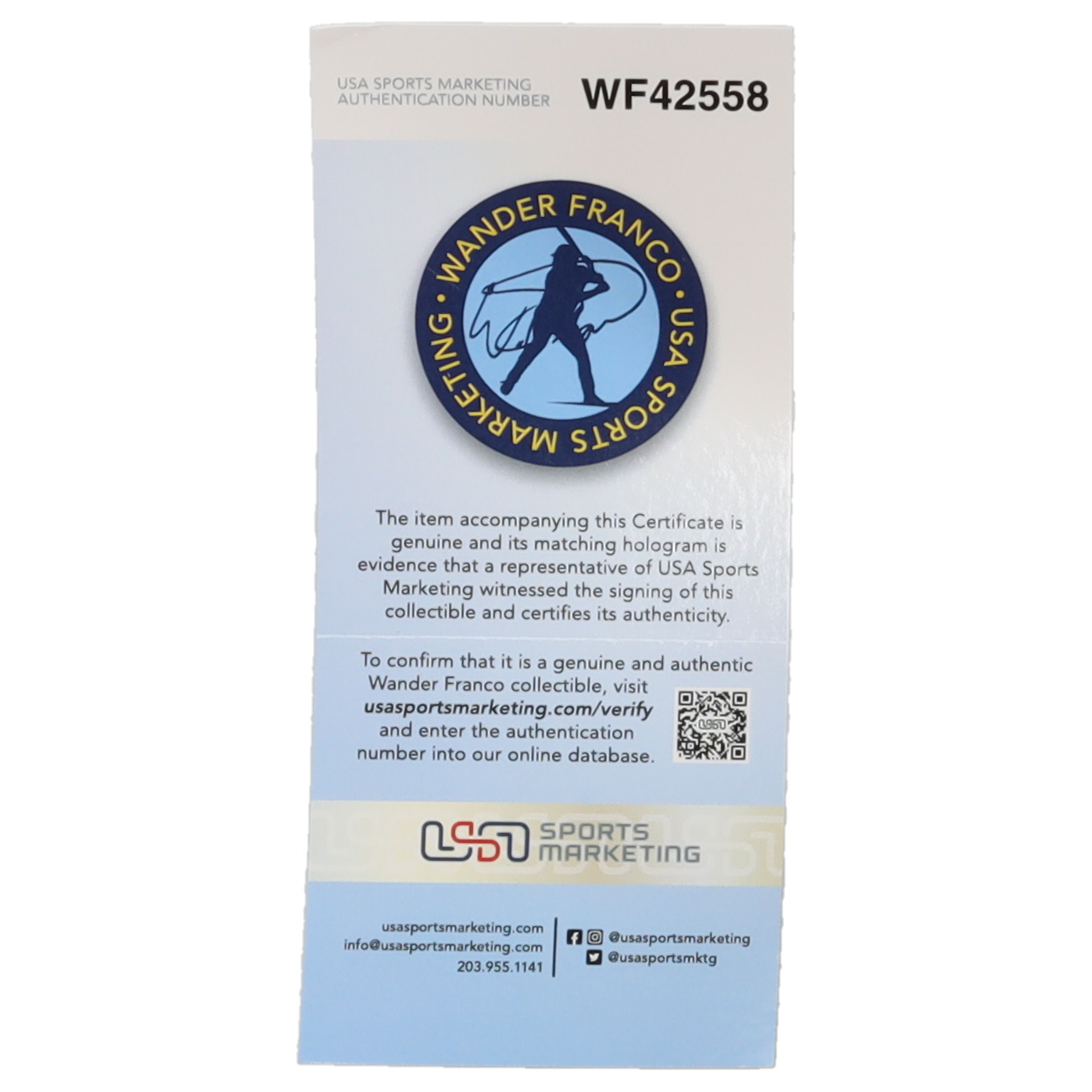 The autograph(s) includes an official James Spence Authentication (JSA) "Signature Debut" hologram. "Signature Debut" is the autographed memorabilia equivalent to a rookie card. The JSA definition of a "Signature Debut" is as follows: "Any item that is autographed and received by JSA prior to the last game of the signer's official rookie season as well as an official USA Sports Marketing Wander Franco hologram and COA for authenticity purposes.