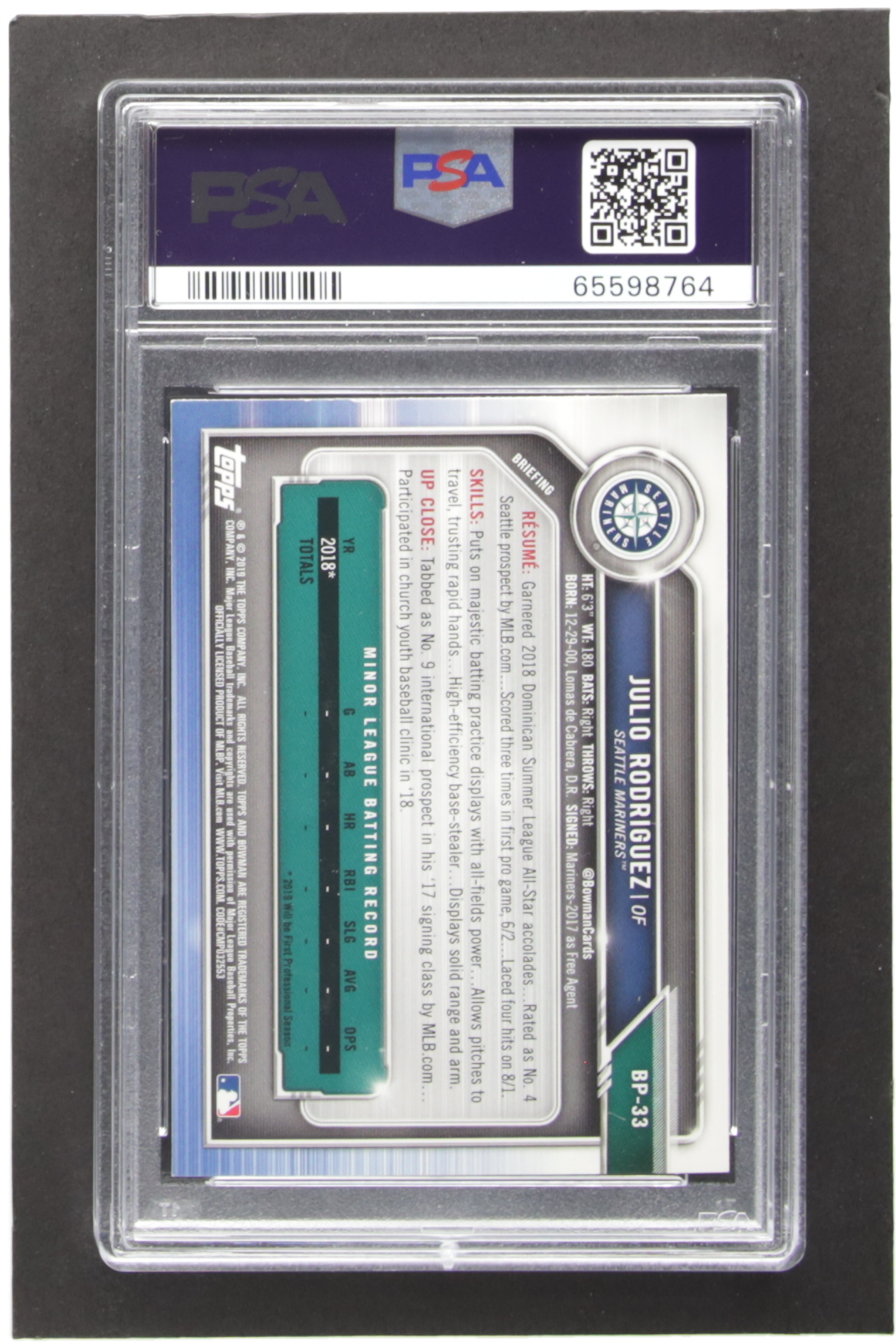 Julio Rodriguez Signed 2019 Bowman Prospects #BP33 RC (PSA)