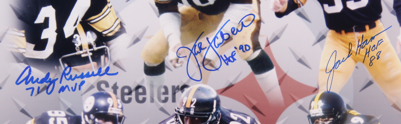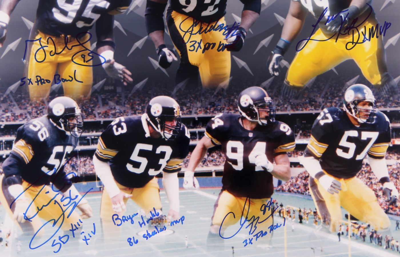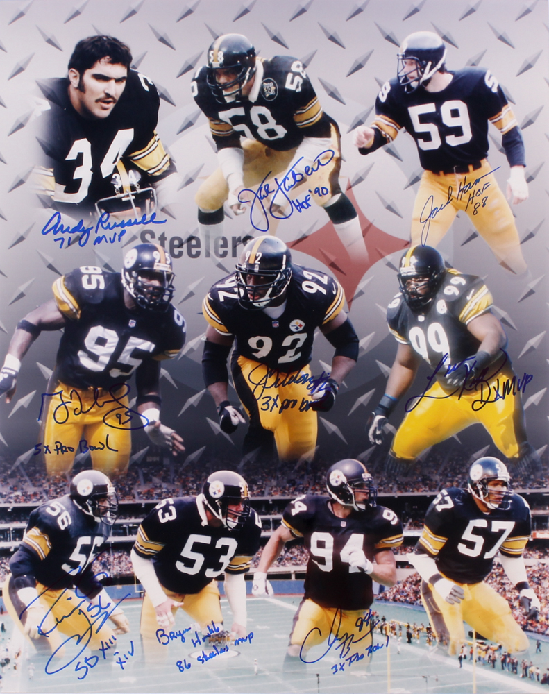 Photo measures 16" x 20" in size and has been hand-signed and inscribed in blue felt-tip pen by (9) Pittsburgh Steelers legends including Andy Russell, Jack Lambert, Jack Ham, Greg Lloyd, Jason Gildon, Levon Kirkland, Robin Cole, Bryan Hinkle, and Chad Brown.