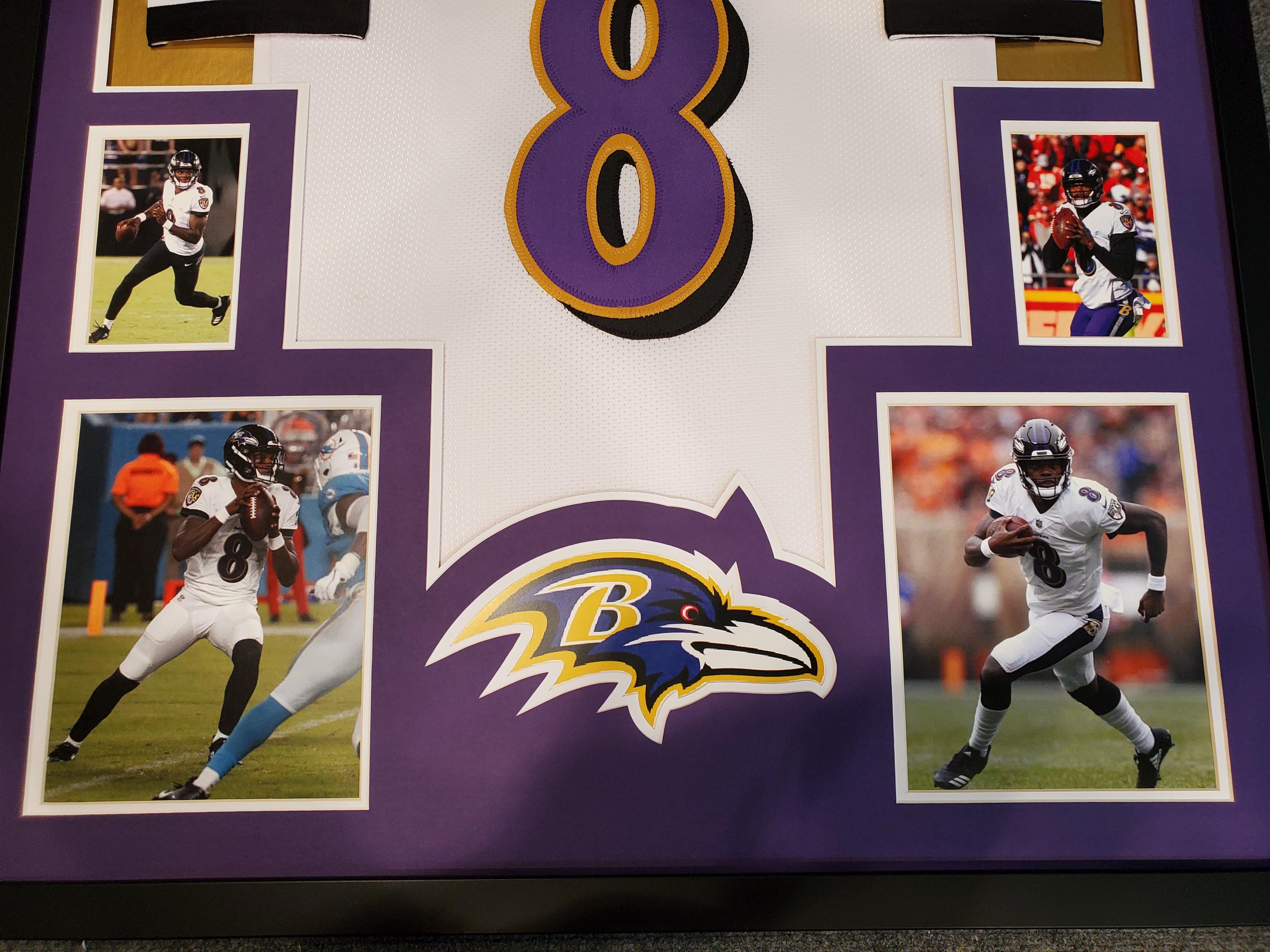 Custom framed display measures 34" x 42" in size and features a jersey of Lamar Jackson. Please note, the jersey is unsigned.
