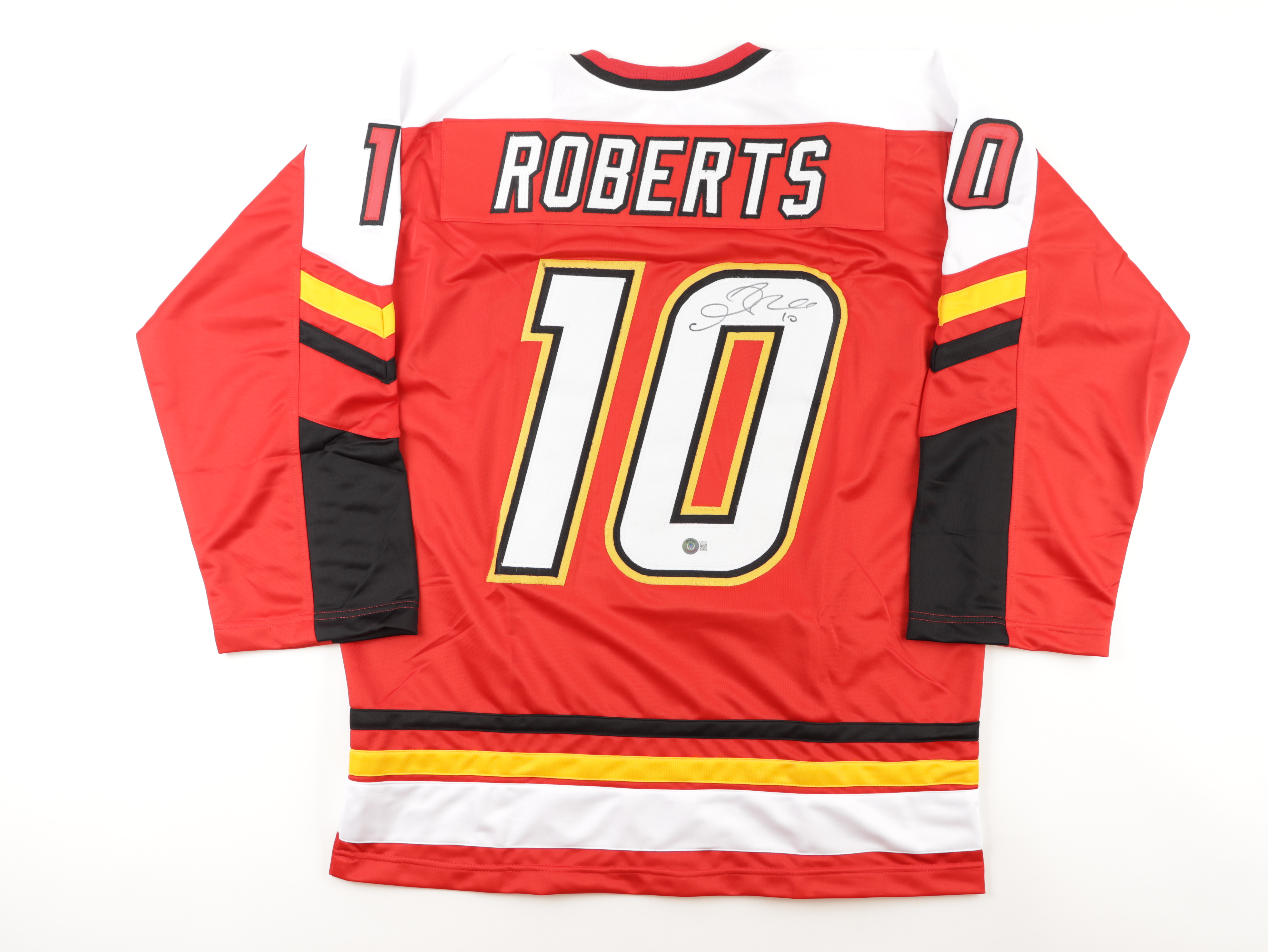 Custom on-ice style jersey. Everything sewn on, size XL. Hand-signed by Gary Roberts.