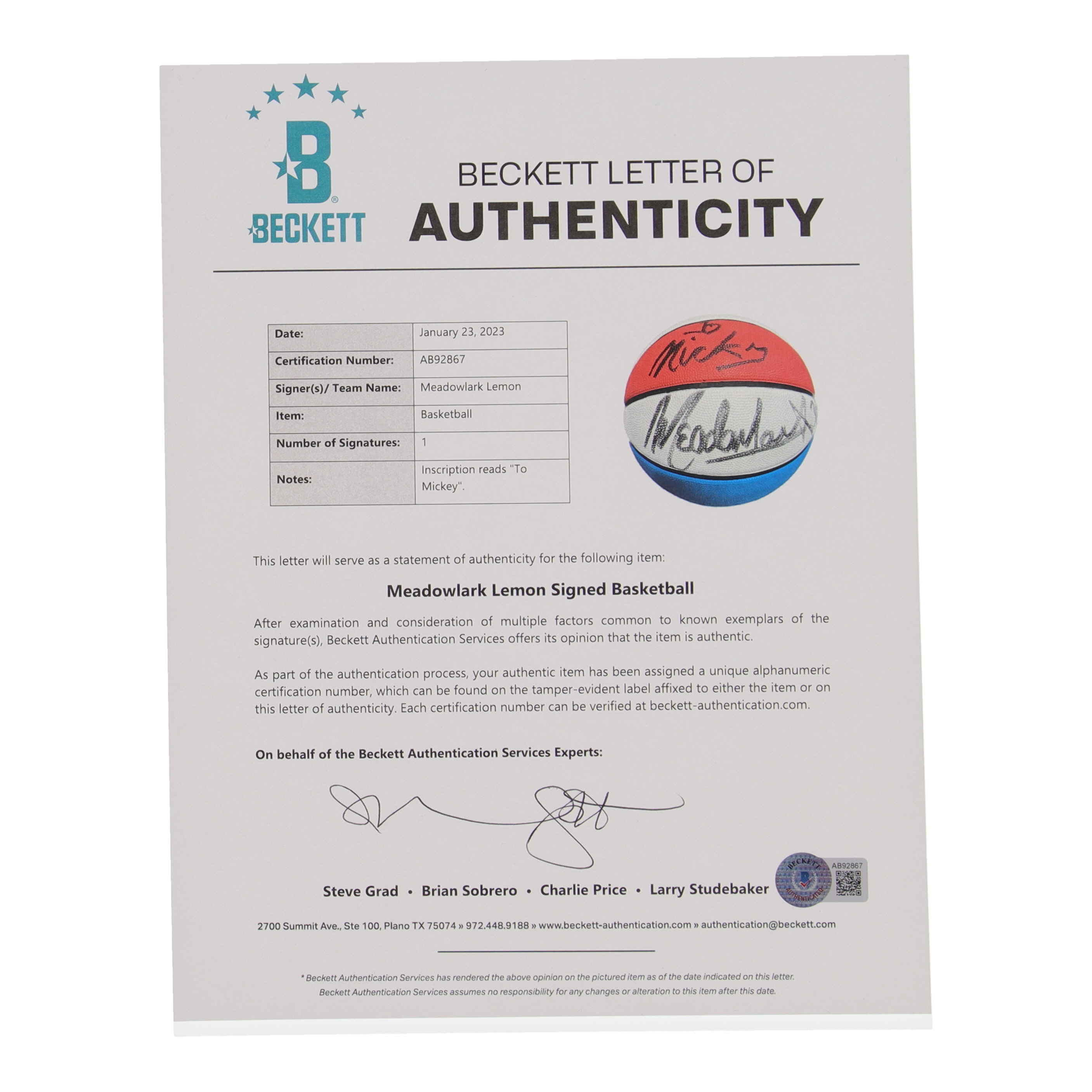 Spalding basketball has been hand-signed by Meadowlark Lemon (D. 2015, Harlem Globetrotters). The signature has been personalized "To Mickey."