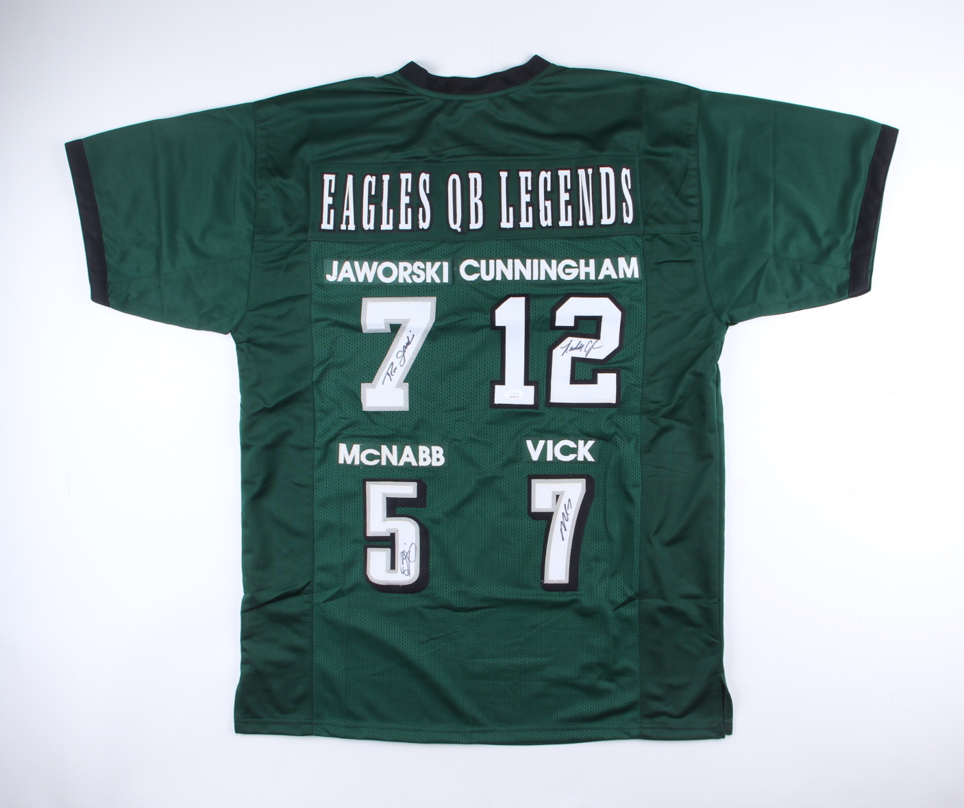 Eagles "QB Legends" Jersey Signed by (4) with Ron Jaworski, Donovan McNabb, Michael Vick & Randall Cunningham (JSA)