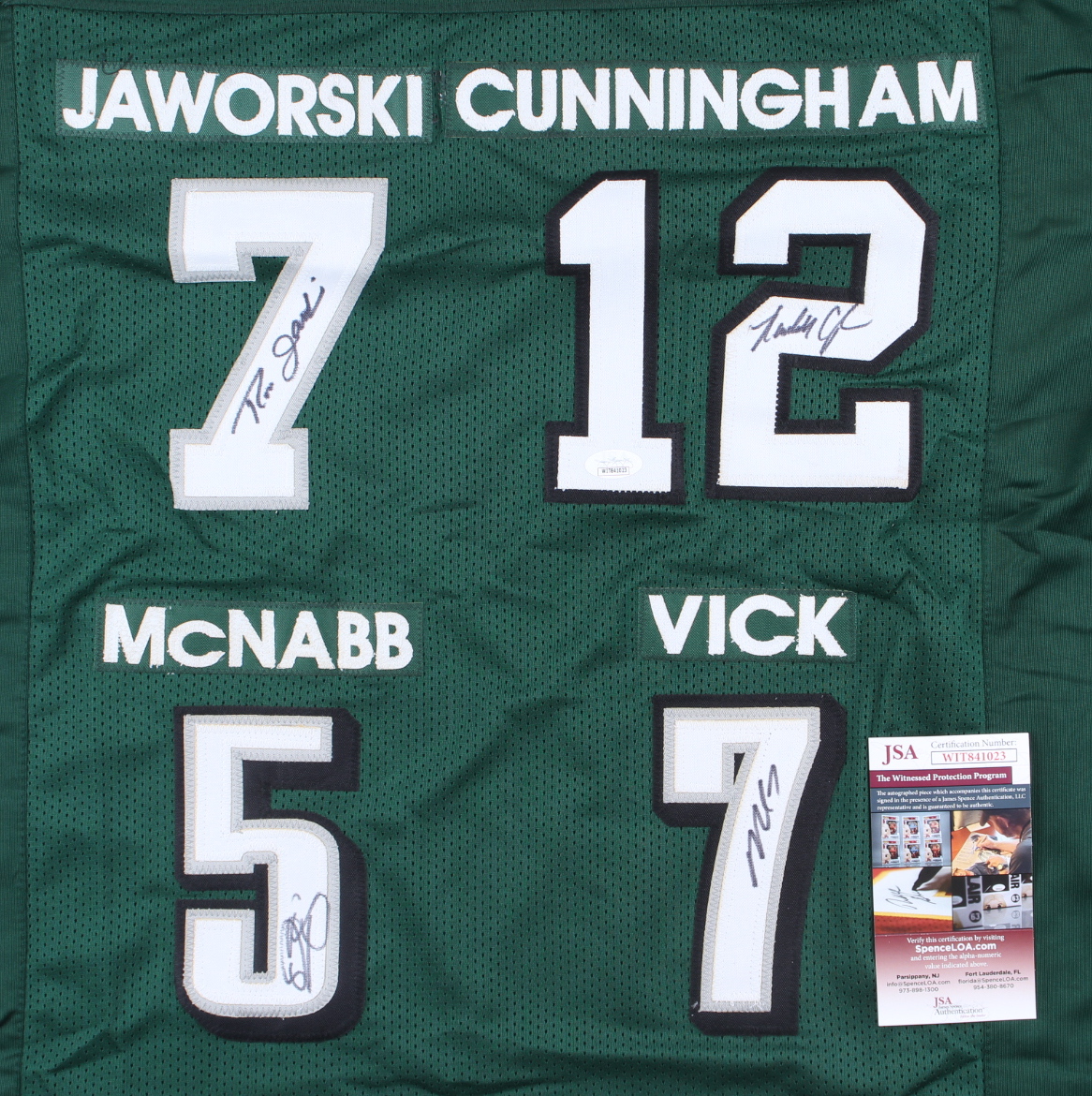 Custom on-field style jersey. Everything sewn on, size XL. Hand-signed by (4) with Ron Jaworski, Donovan McNabb, Michael Vick and Randall Cunningham.