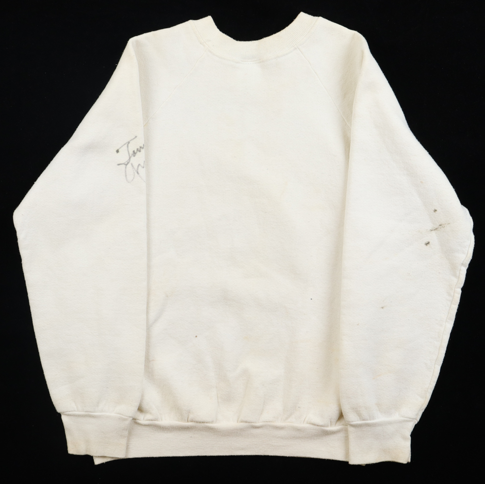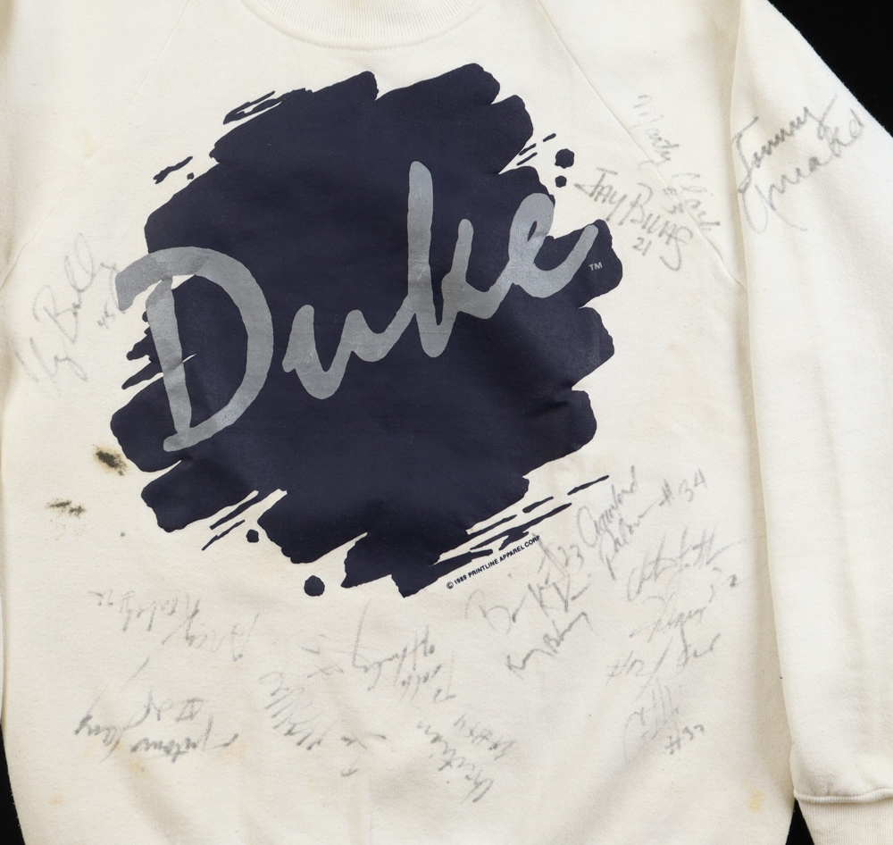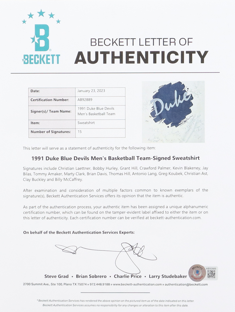 1991 Duke Blue Devils Basketball Sweatshirt. Team-Signed by (15) with Christian Laettner, Bobby Hurley, Grant Hill, Crawford Palmer, Kevin Blakeney, Jay Bilas, Tommy Amker, Marty Clark, Brian Davis, Thomas Hill, Antonio Lang, Greg Koubek Christian Ast, Clay Buckley and Billy McCaffery. Please note, the sweatshirt has staining and the autographs are faded.
