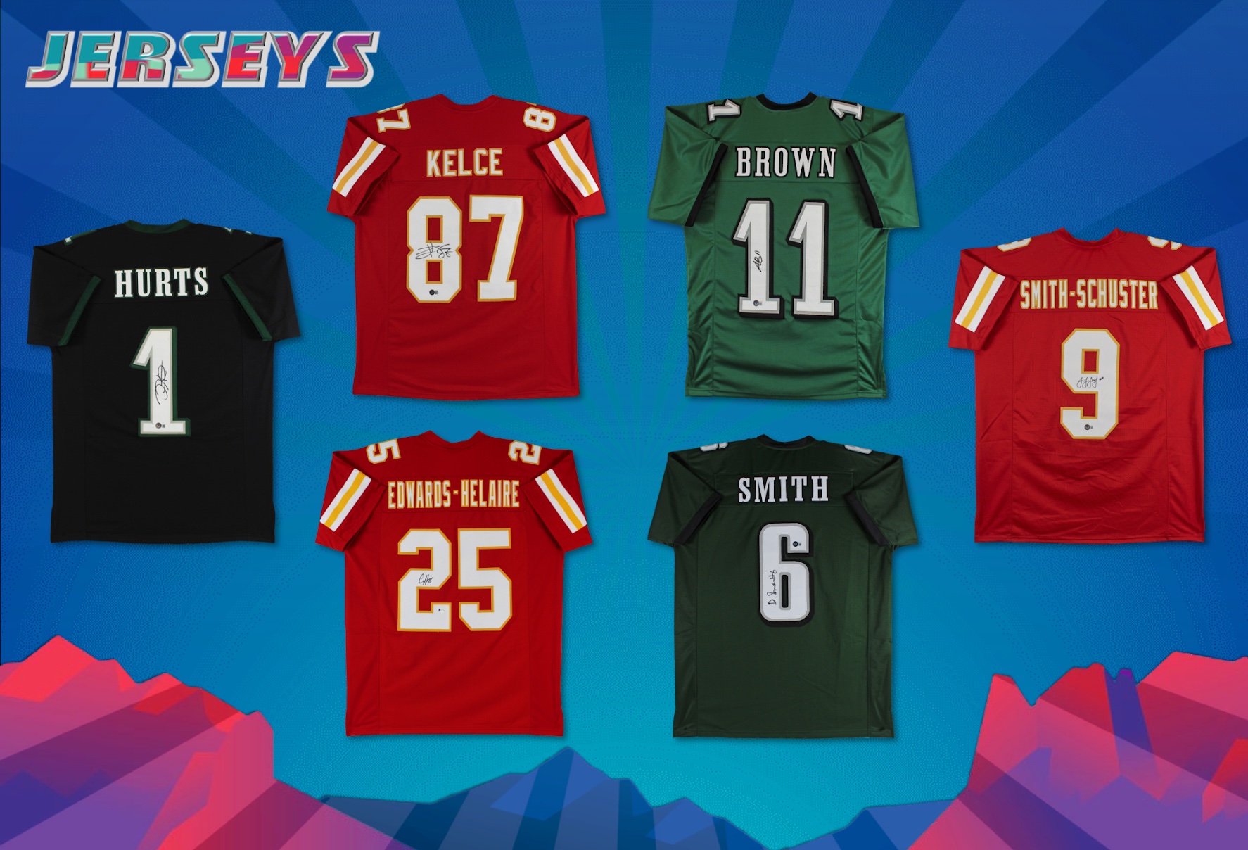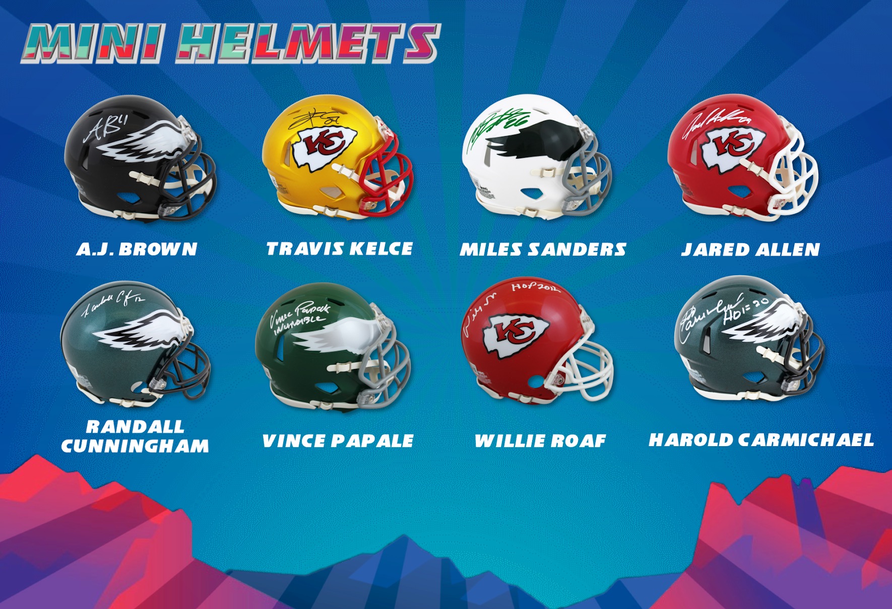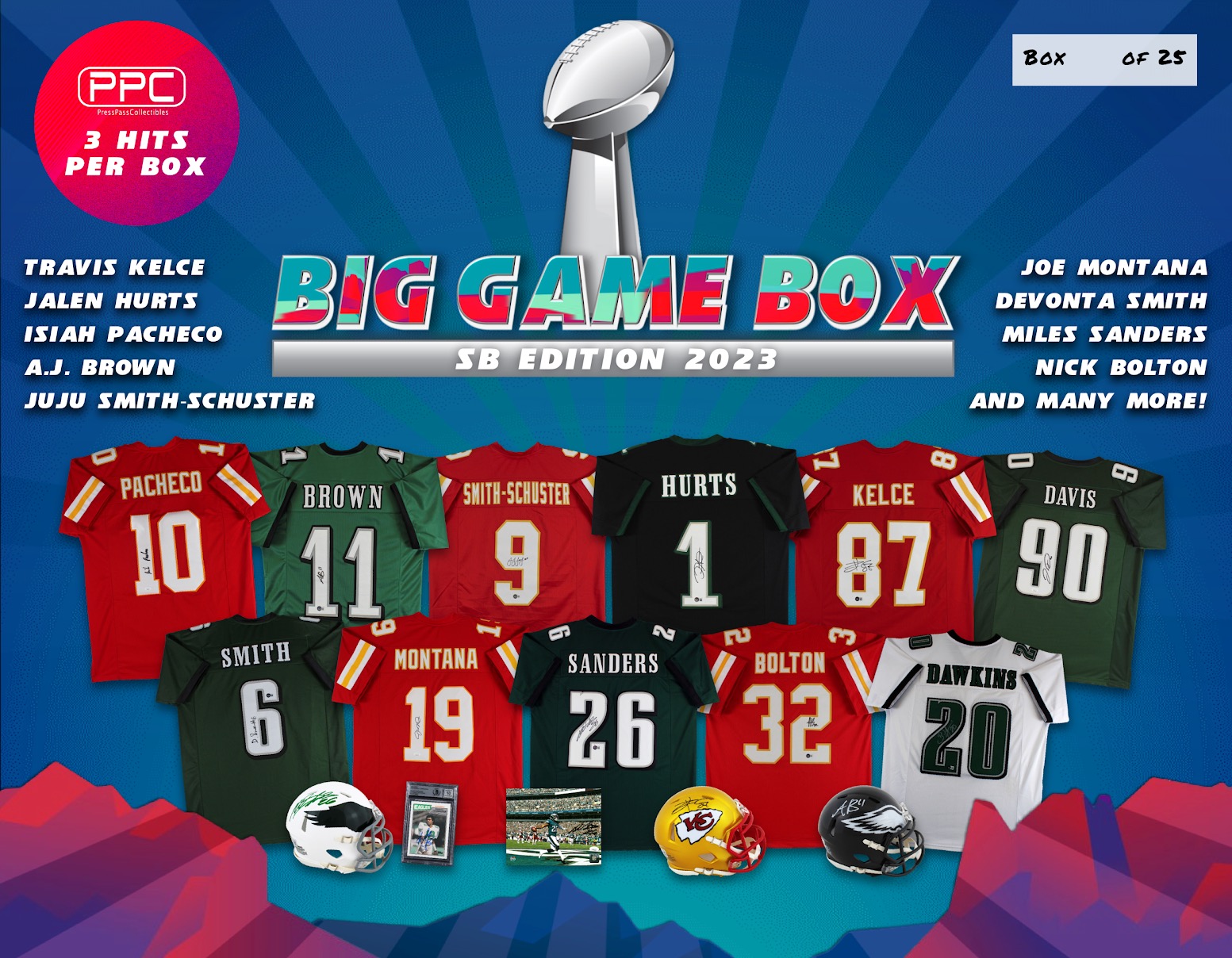 The Press Pass Collectibles 2023 The Big Game Box Edition mystery box includes (3) items per box. A variation of items including Jerseys, Mini Helmets, Footballs, Slabbed Trading Cards, and photos. You are guaranteed a Jersey and a mini helmet in each box plus an additional item! This is a perfect chance to snag your piece of Super Bowl history from winners of the past and the future!