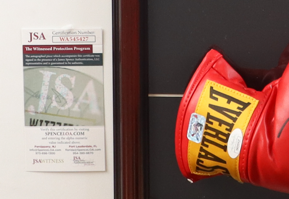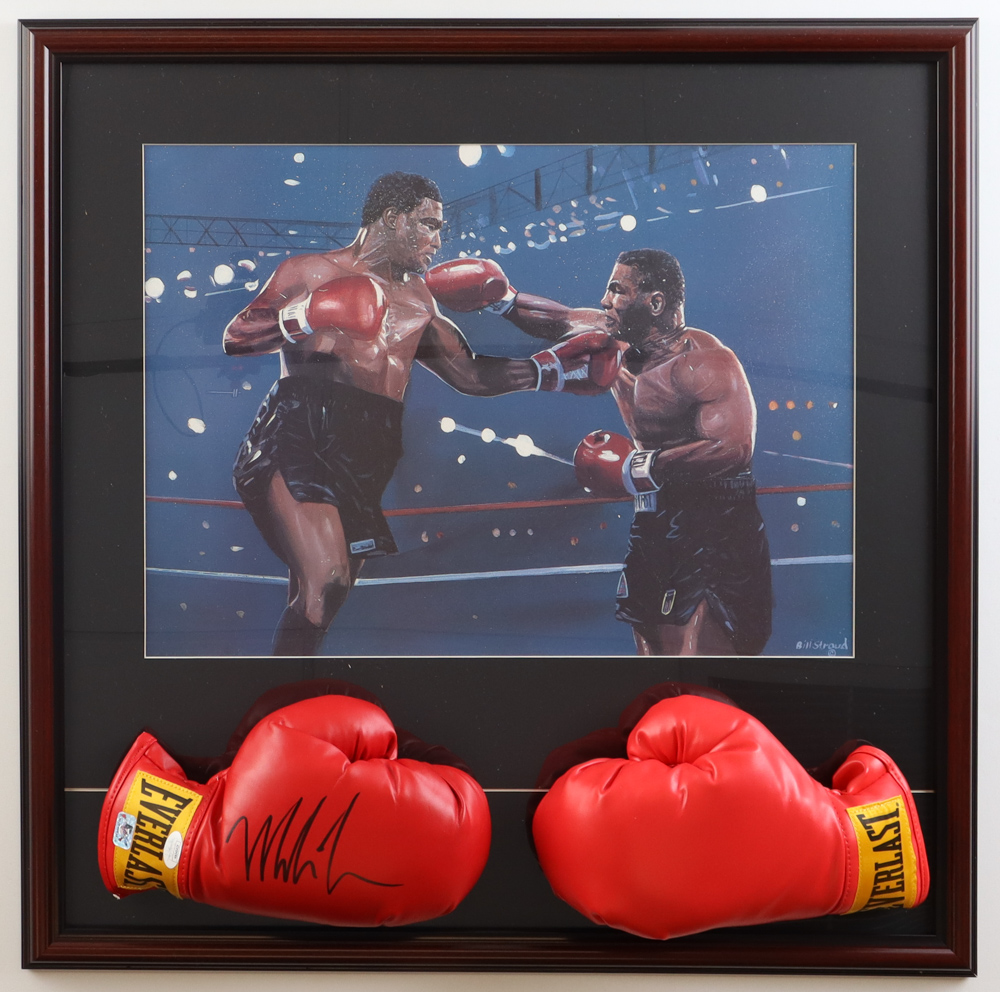 Custom frame measures 26" x 26" in size and features a pair of Everlast boxing gloves that has been hand-signed on the right glove by Mike Tyson (HOF).