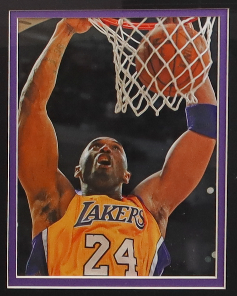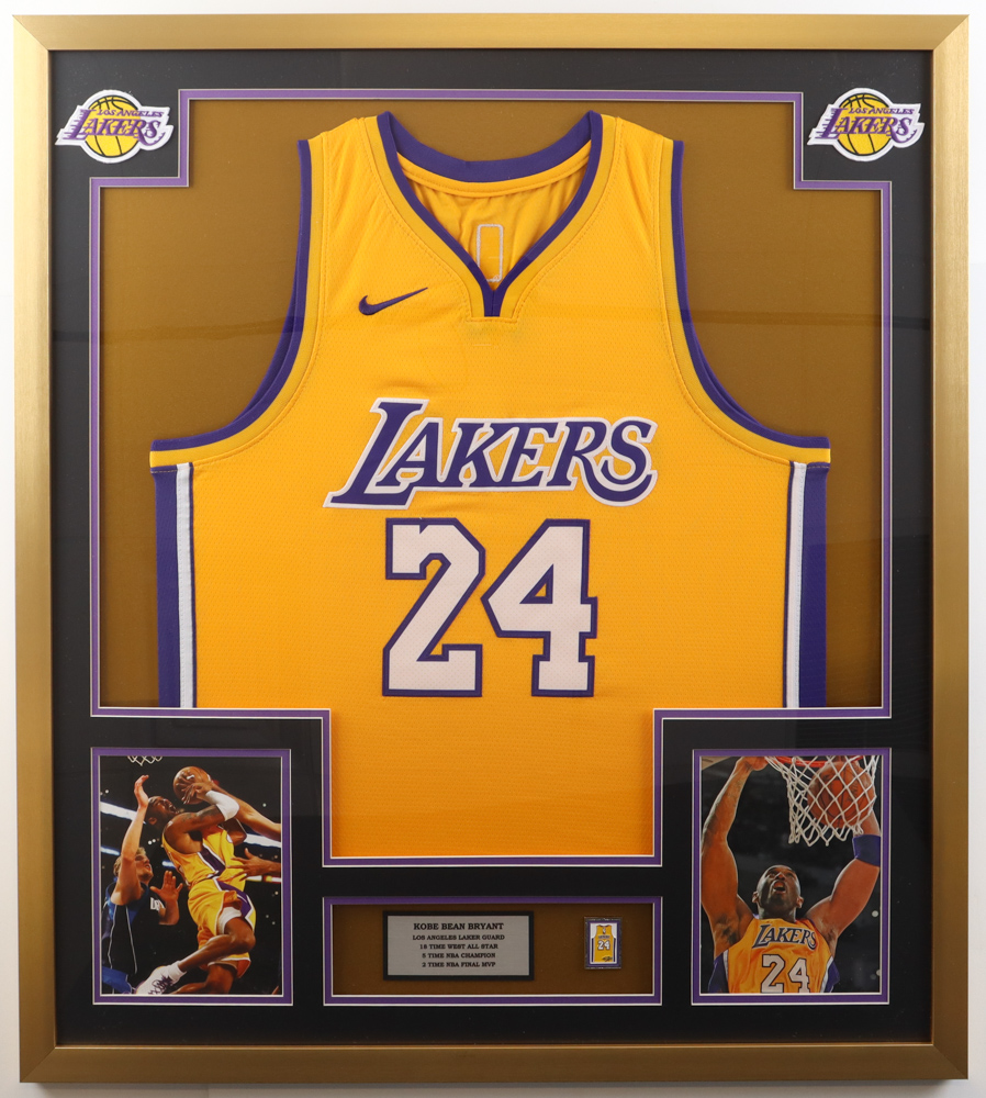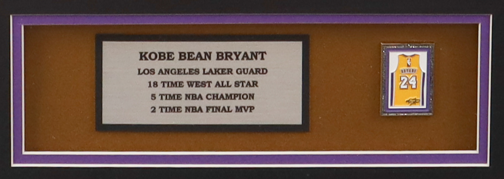 Custom frame measures 32" x 36" in size and features an unsigned Nike on-court style Kobe Bryant (D. 2020, Los Angeles Lakers, HOF) jersey. The display also includes a Kobe jersey retirement pin and (2) photos. Please note, the display is unsigned.