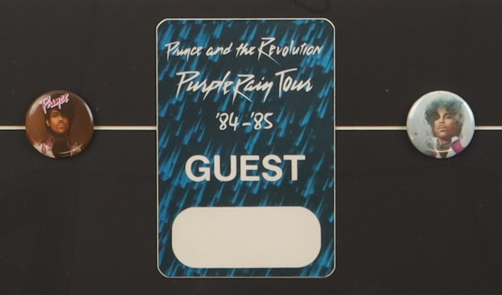 Custom framed display measures 15" x 26" and features a "Prince and The Revolution: Purple Rain Tour" poster print. Display also features an original backstage pass from the 1984-85 Purple Rain Tour as well as (2) Prince Pins.