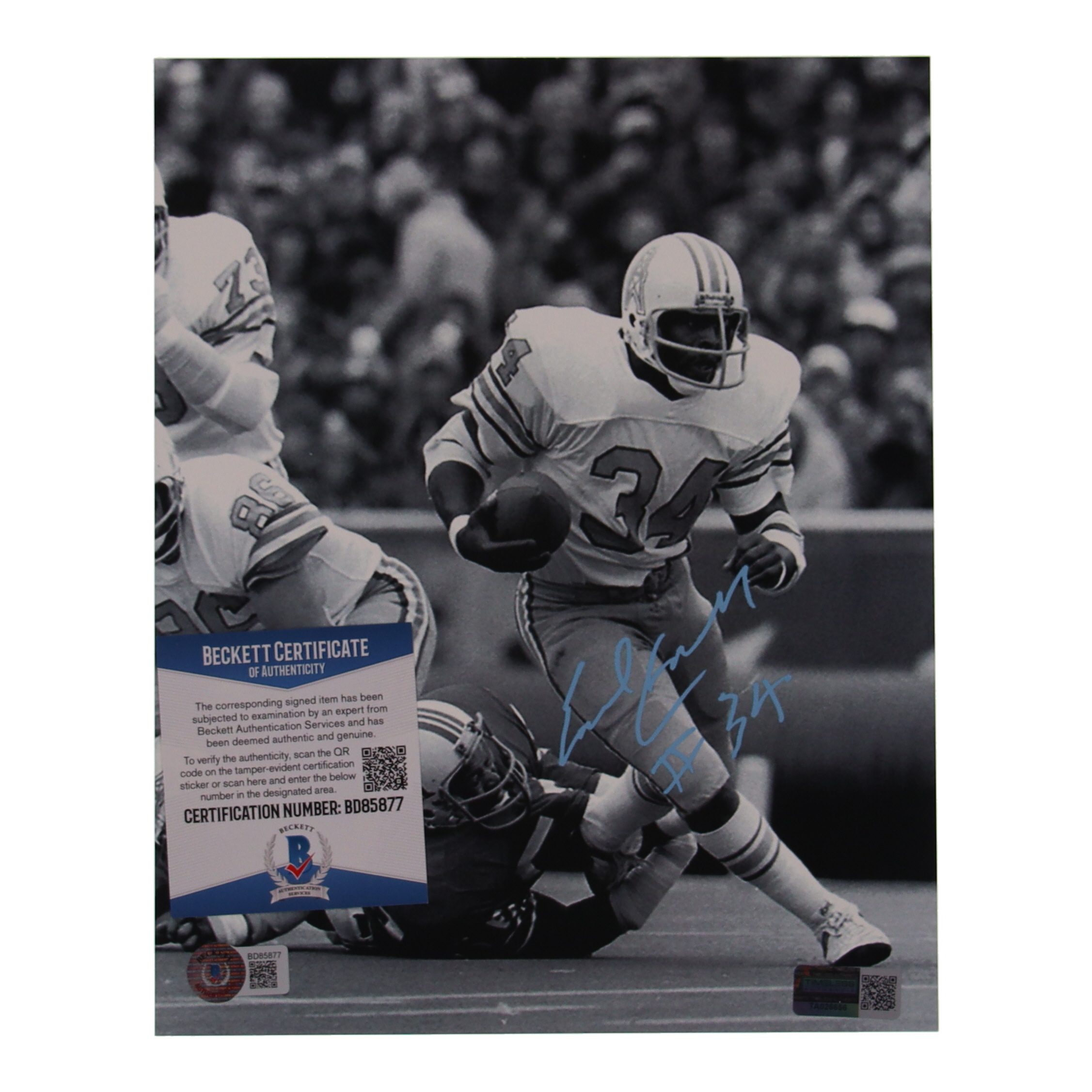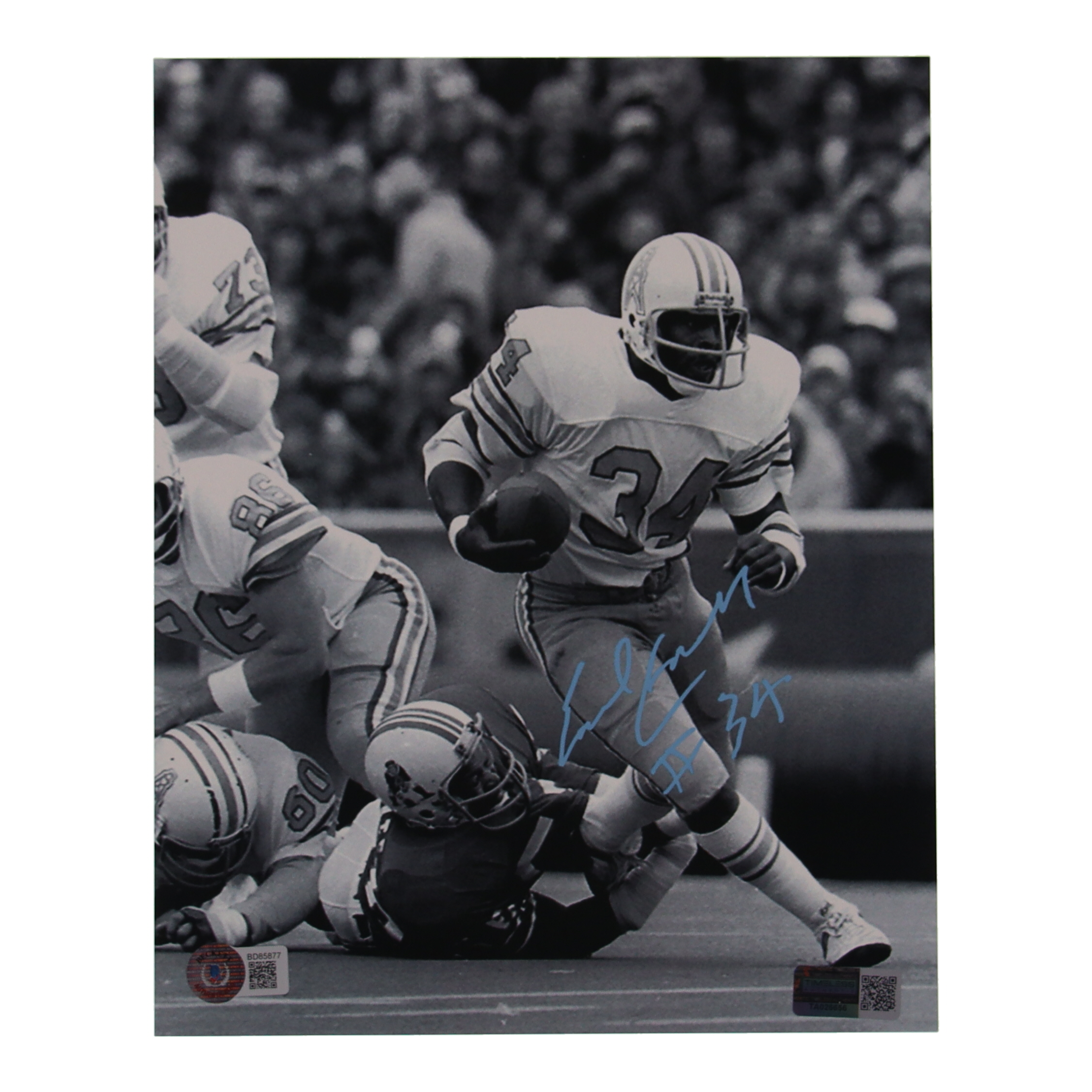 Photo measures 8" x 10" in size and has been hand-signed by Earl Campbell (Houston Oilers, HOF).