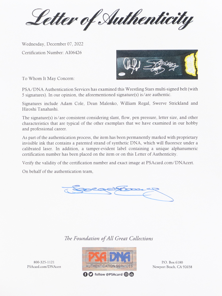 AEW Championship Belt Signed by (5) with Adam Cole, Dean Malenko, William Regal, Swerve Strickland (PSA)
