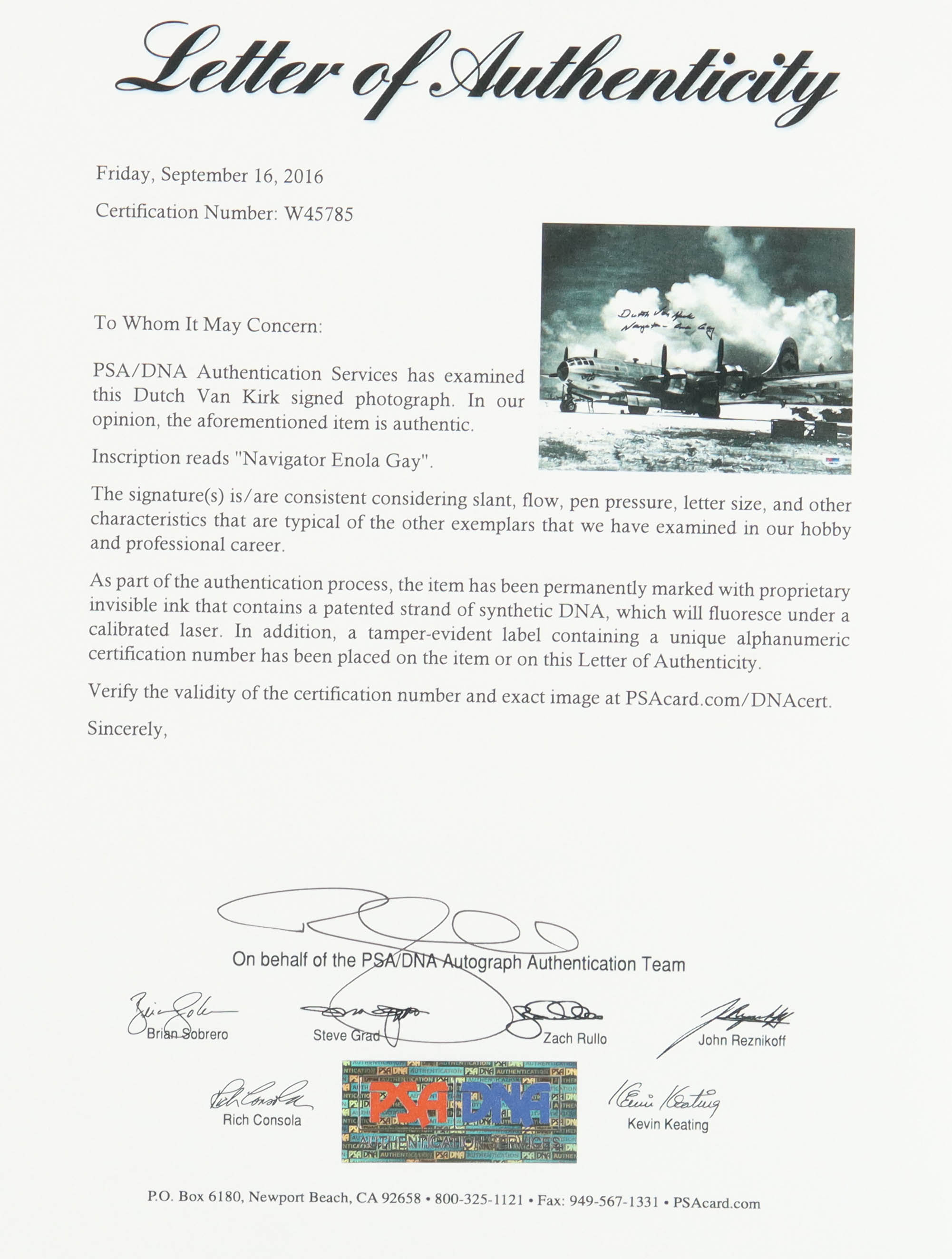 Photo measures 11" x 14" in size and has been hand-signed and inscribed by Theodore "Dutch" Van Kirk (D. 2014).