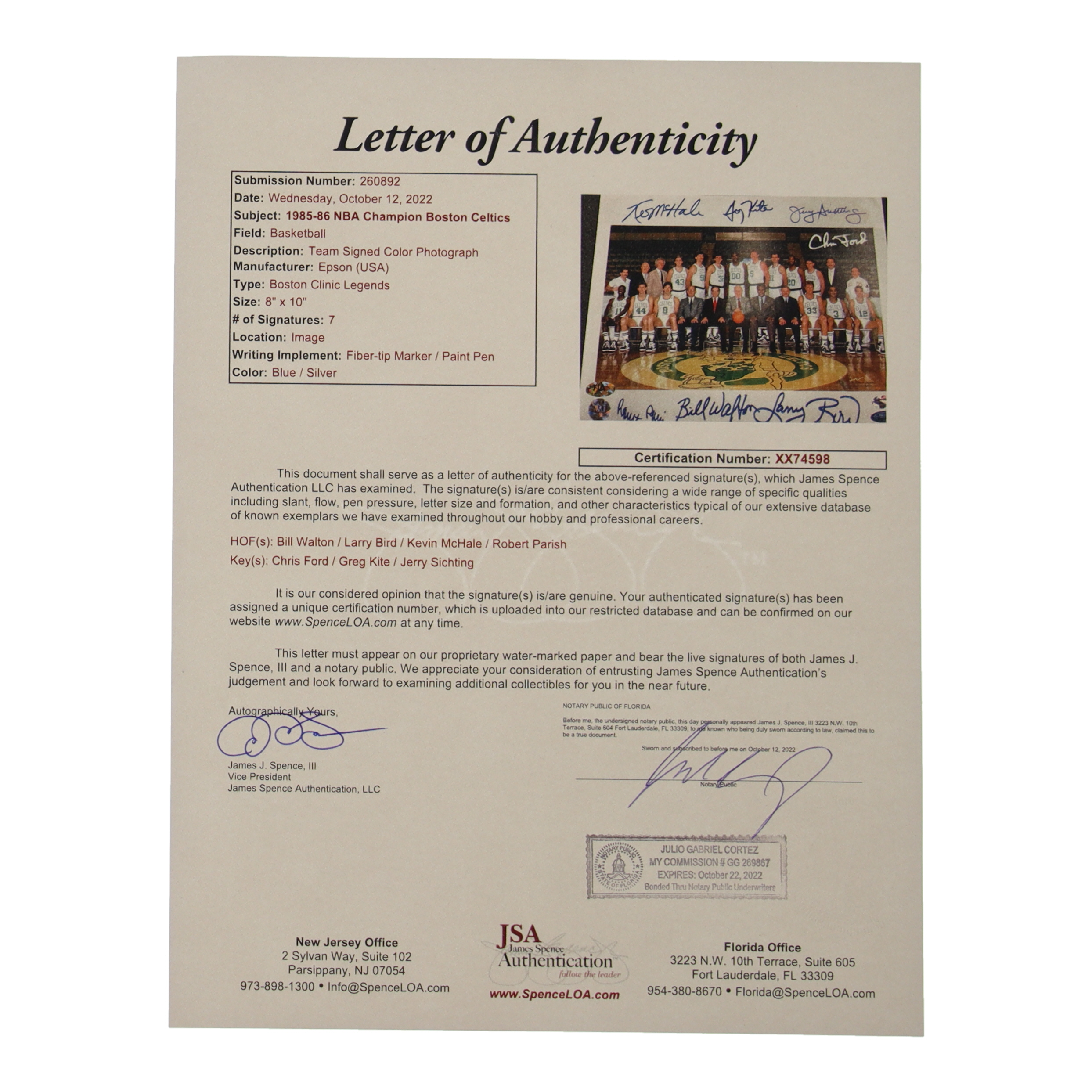 Photo measures 8" x 10" in size. Hand-signed by (7) including Bill Walton, Larry Bird, Kevin McHale, Robert Parish, Chris Ford, Greg Kite, Jerry Sichting.